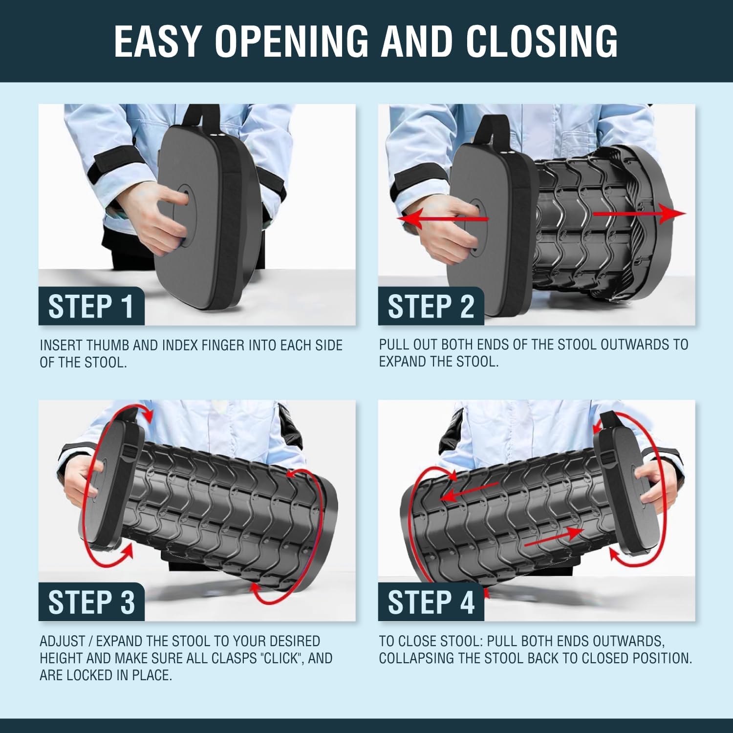 - 🦍【2025 UPGRADED, US-PATENTED FOLDING STOOL】Our 2025 Upgraded Collapsible Square Stool with a fish scale structure body shape is redesigned and locks safer than the previous version, made with Durable, Heavy-Duty, Reinforced Polypropylene Plastic for a safer and sturdier seating experience while managing to lower the weight of the folding stool for mobility and portability.