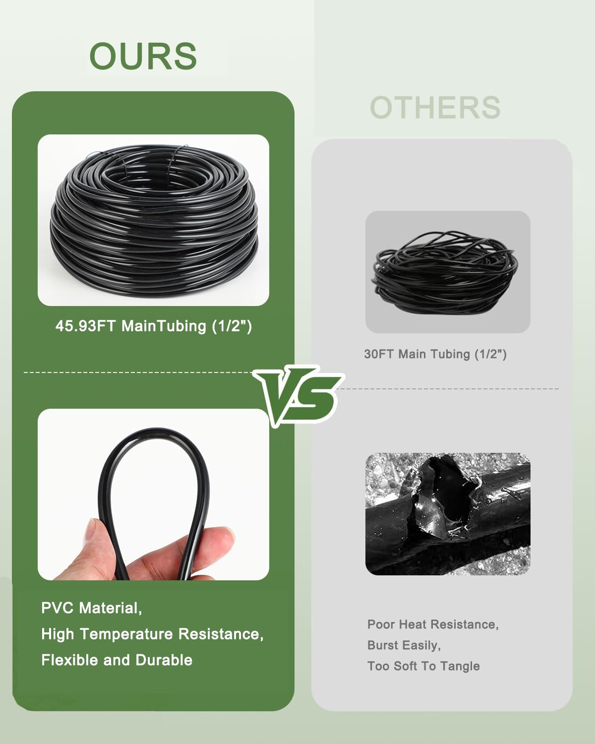 - 🌱 Reliable Water Supply for Your Entire Garden: This upgraded irrigation system connects directly to your water source via a female coupler and uses 1/2" tubing as the main line, branching out with 1/4" tubing to cover a wider area. The system supports up to 20 drip emitters, ensuring that all your plants—near or far—receive consistent and adequate hydration.