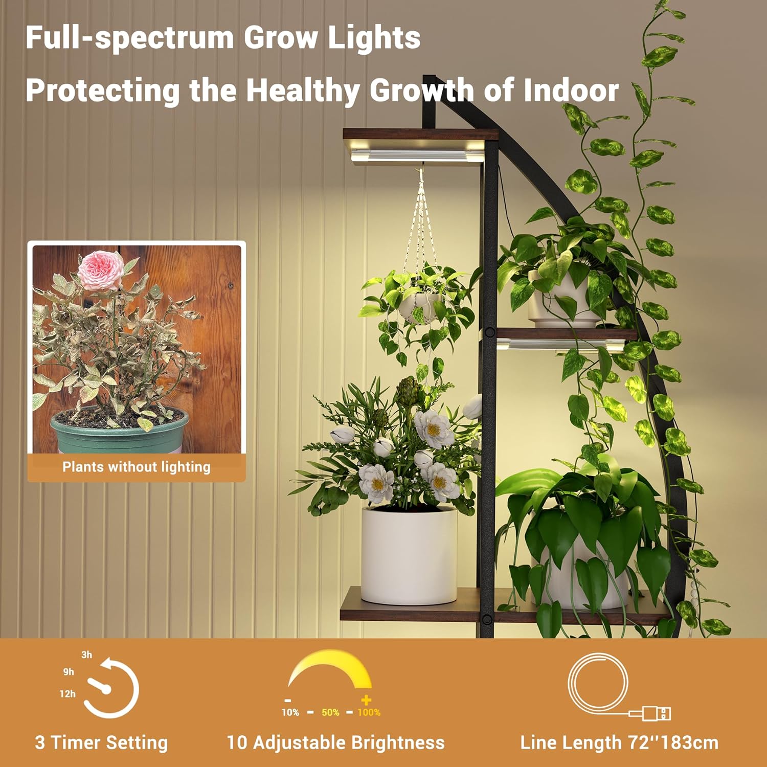- 【Plant Stand with Smart Lighting Control】Our metal plant stand is equipped with a powerful full-spectrum grow light. Using advanced LED chips, 3 switch modes, 3H/9H/12H timing settings, and 10-level brightness adjustment, it offers diversified lighting options to meet the lighting conditions required by plants at different growth stages. The three-head plant lights ensure that plants on all levels can receive sufficient light. This plant shelf can be placed anywhere indoors, and there is no need to move plants outdoors to absorb light frequently.