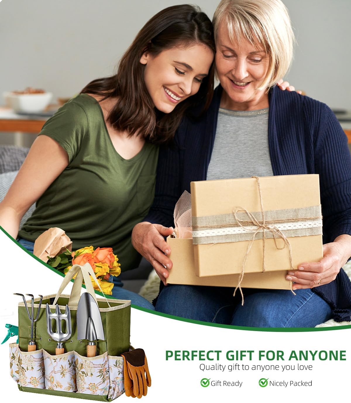 9-Piece Premium Gardening Tool Set for Women - Heavy Duty Stainless Steel Rust-Proof Tools with Fashion Storage Tote | Perfect Gardening Gifts for Mom, Mother's Day, Birthday & Outdoor (Green)