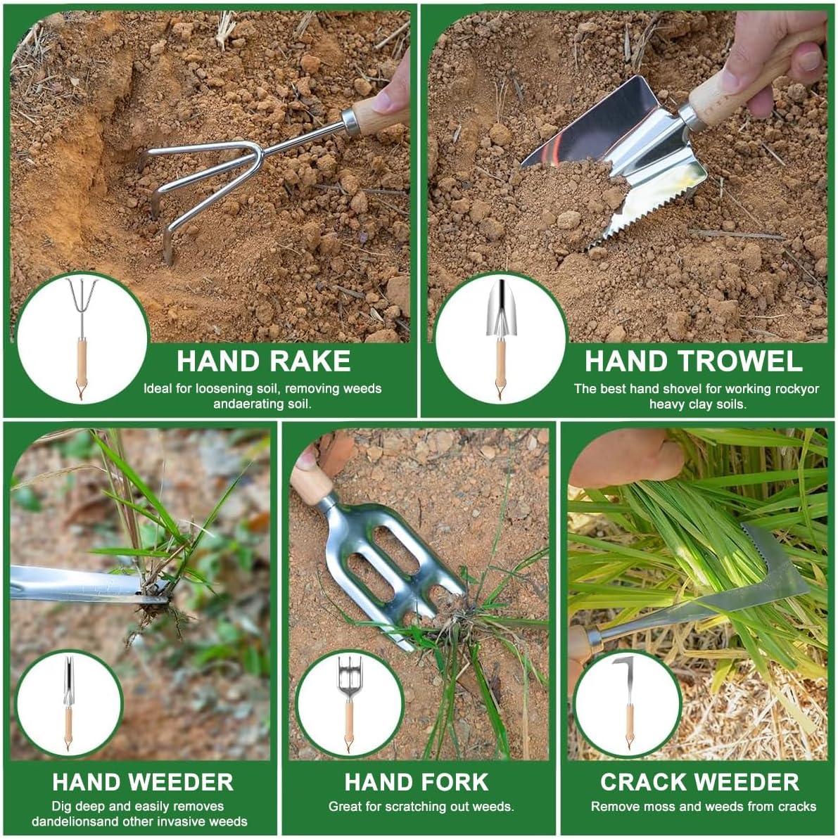 - Ergonomic Non-Slip Handles: Thoughtfully designed for maximum comfort and control, the non-slip wooden handles fit comfortably in hands of all sizes. Whether you're using the pitchfork for turning compost or other tools for digging, carrying, weeding, planting, and pruning, these handles make every task effortless, enhancing both functionality and user experience.
