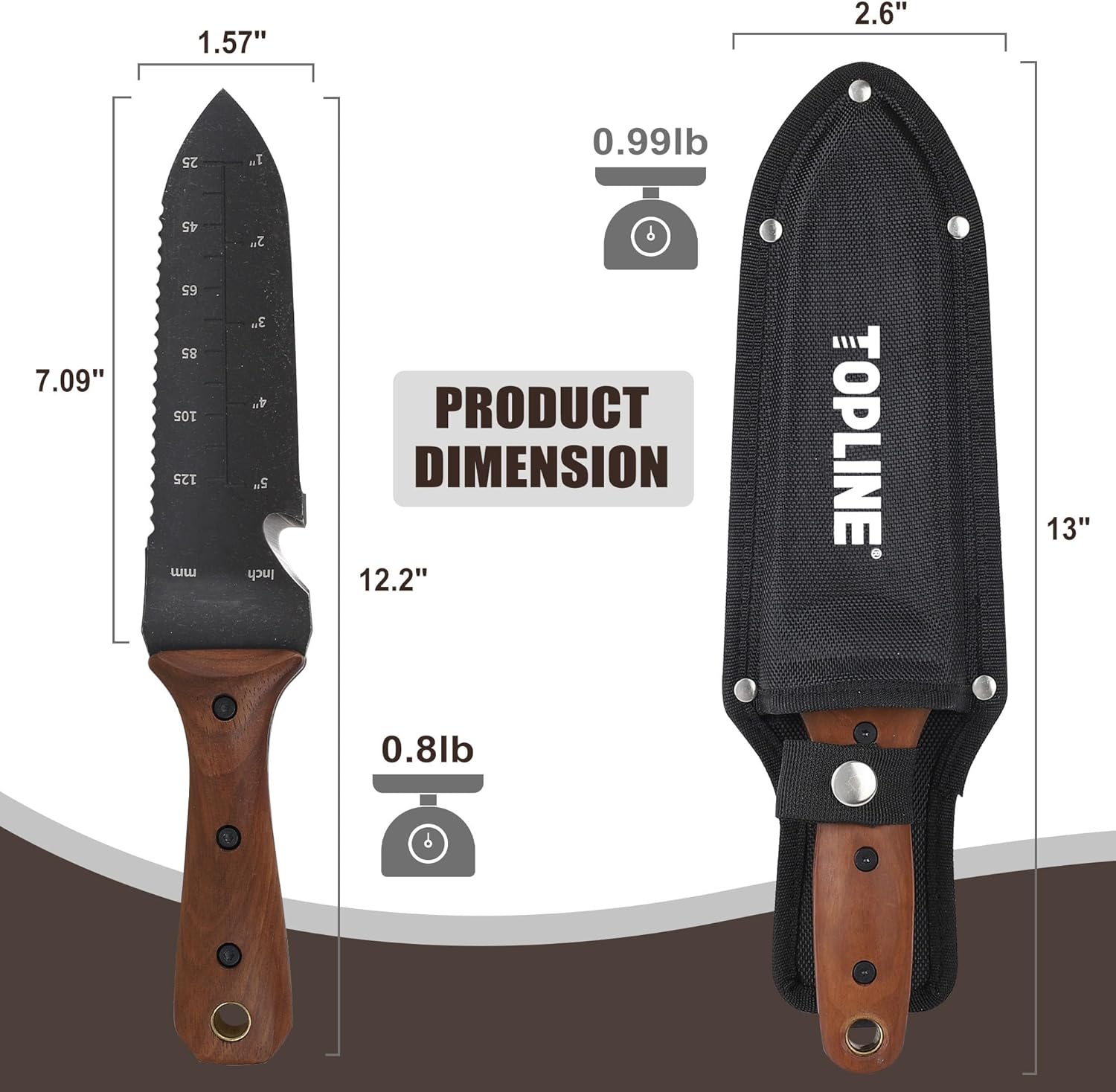 TOPLINE Hori Hori Garden Knife with Oxford Sheath, 7" Stainless Steel Blade with Cutting Edge, Full Tang Walnut Handle with Hanging Hole, Multifunctional Garden Tools for Weeding, Planting, Cutting
