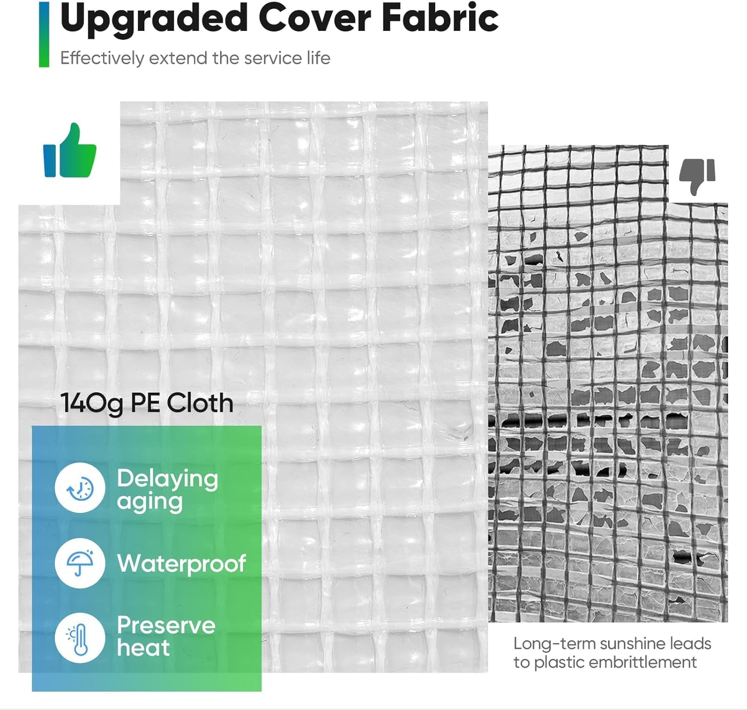 - UV Protected Durable Cover - Odorless waterproof PE cover meets the UVI level 6 standard, protecting plants from sun burnt. For PE Cover Edging design, you can put weights down to seal the bottom or just bury it in the soil for heat preservation, air tightness, humidity and temperature. 3-layer stitching cover can effectively avoid tearing during use.