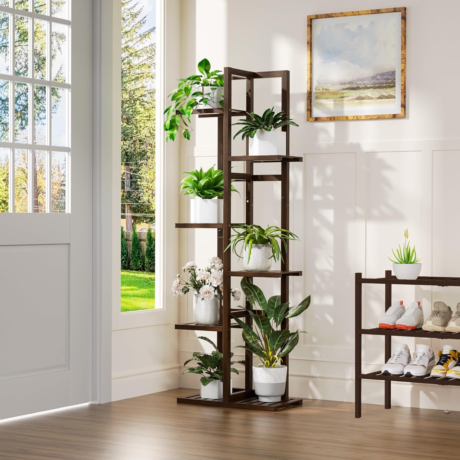 - Vertical Design - bamboo plant stand has 6 tiers to allow for 7 potted plants. It's perfect for displaying a variety of greenery, easy to clean and waterproof, making it perfect for your everyday use.