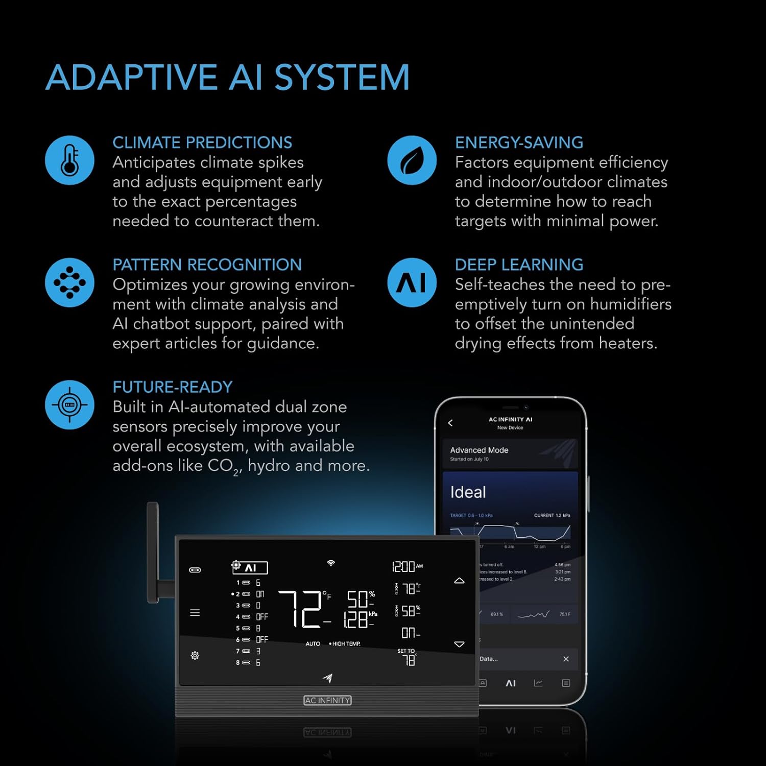 - Control your setup from anywhere via WIFI with our app, featuring real-time AI insights, guides, alerts, charts, and the ability to chat with our AI bot about your grow.