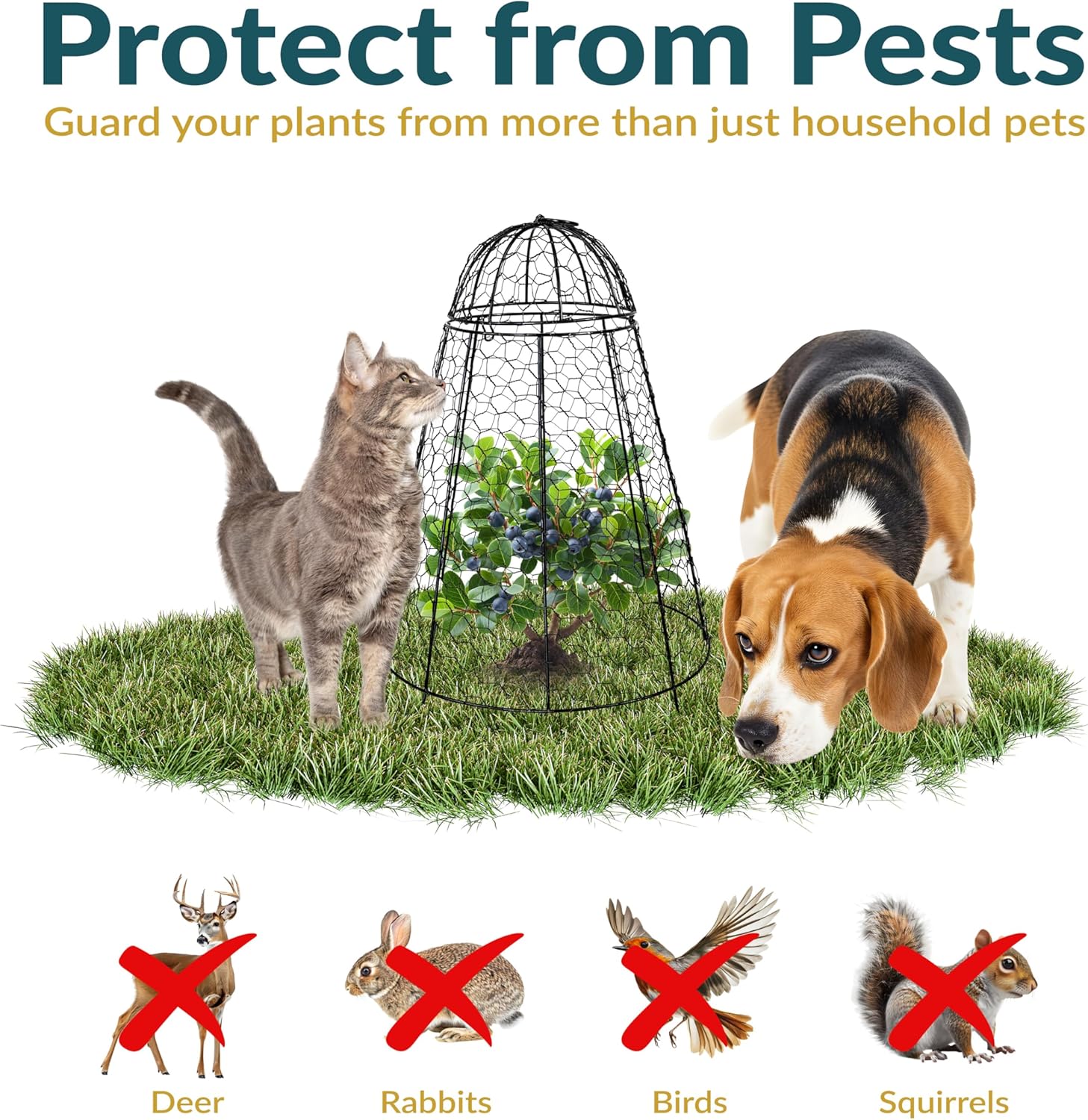 - PROTECT PLANTS FROM ANIMALS: This wire mesh plant protector will defend plants against a variety of animals including birds, rabbits, chickens, squirrels, deer, and cats. The chicken wire mesh makes it difficult for animals to eat the leaves. This humane method of plant protection will not harm animals or the environment. Plus, the cages can be used indoors to protect houseplants from pets like cats and dogs, and its tall size helps prevent plants from being trampled by animals and humans alike.
