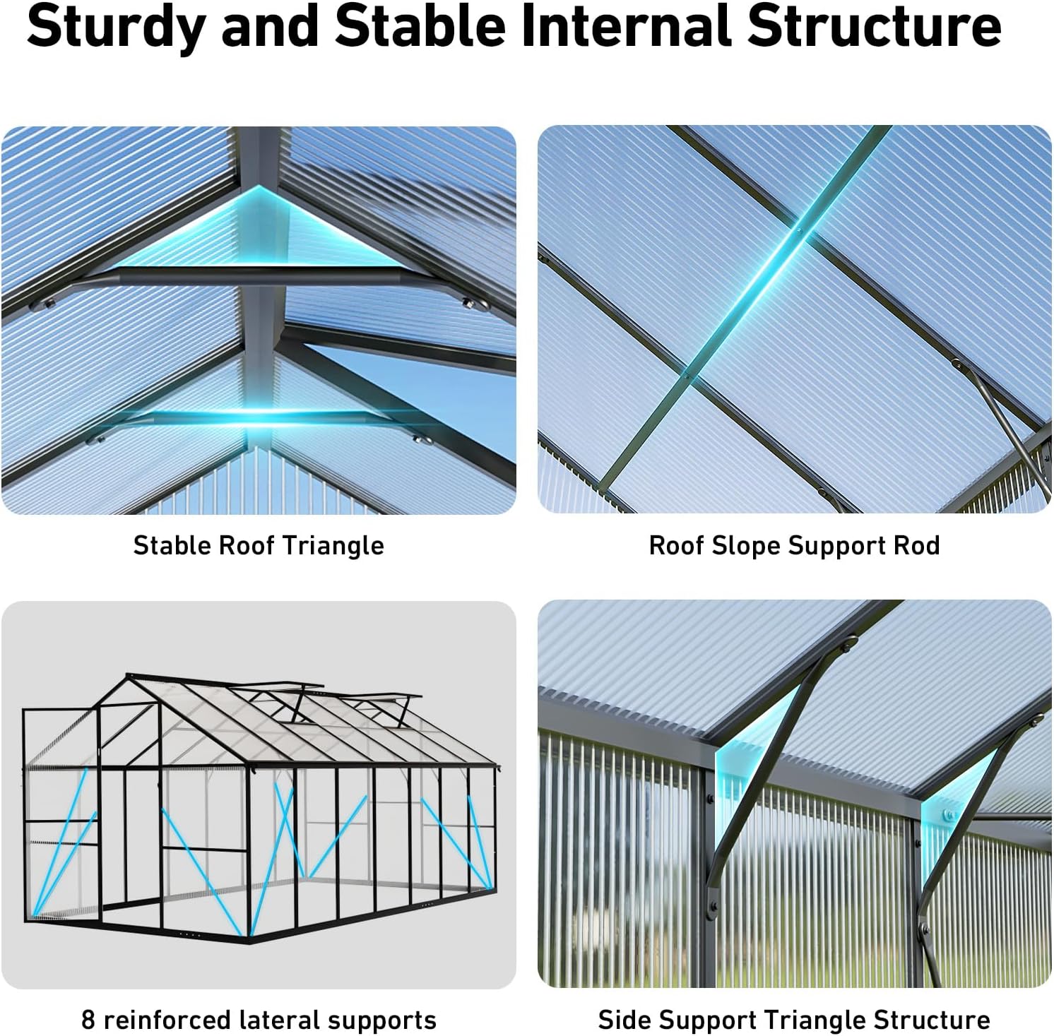 - Durable & Stable Structure-This polycarbonate greenhouse is built with a high-quality reinforced aluminum alloy frame and strengthened corners for excellent stability. Designed to handle tough outdoor conditions like strong winds, heavy rain, and snow. For added strength, you can seal the panel gaps with silicone (not included), making it a reliable green house for year-round use.