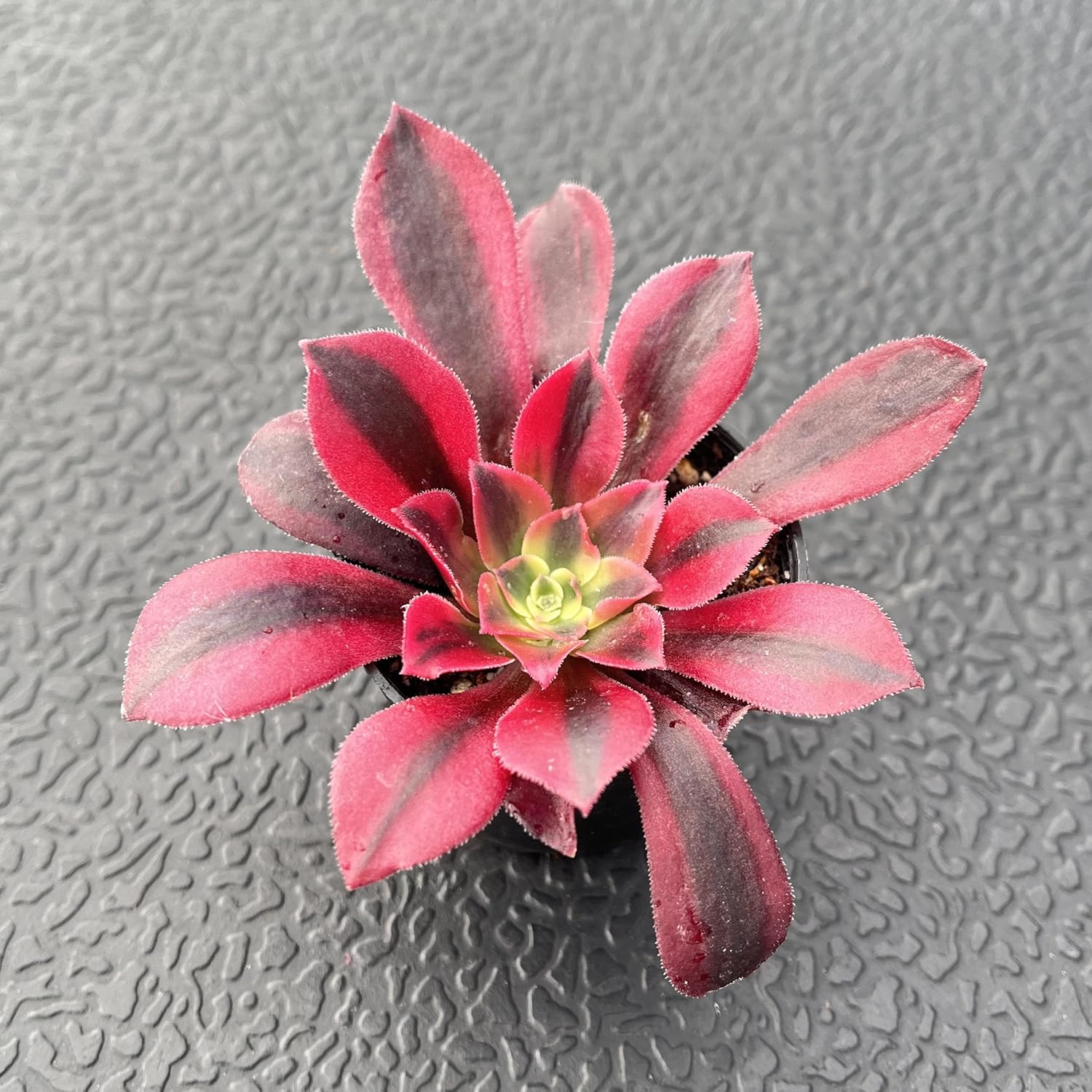 - Aeonium 'Meidusha': Known for its striking visual appeal. Its pink leaves are mixed with black stripes. It features offset rosettes formed by variegated spoon-shaped leaves, soft-tipped with slightly fringed edges. It has the capacity to reach a height of up to 18in and a width of 16in, readily producing offsets at a young stage to rapidly develop an appealing cluster