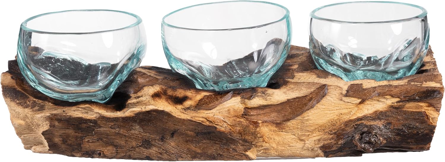- ONE OF A KIND: Because each beautiful planter display is hand-made, each is unique. To assemble: simply set the glass topper on the driftwood base in the natural grooves of the base. The item is constructed by pressing the glass into the base, so each has a unique formation. Once correctly aligned, it will be a perfect fit! Simply place the glass to the base and you are all set to start displaying! Approximate overall size: 4"H x 13"L x 6"W, with 3 terrariums measuring 3.5" Diameter.