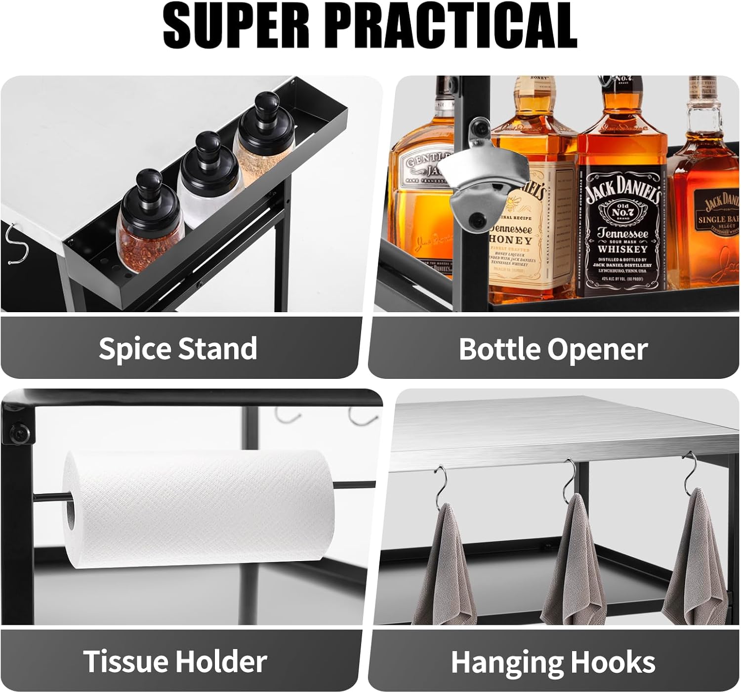 - Spacious Outdoor Prep Station: Tabletop size:43.31" x 19.69".This outdoor grill table has oversize table top surface and side table provide ample work area for food prep,outdoor cooking.Equipped with multiple storage tools including 8 S-shaped hooks, a tissue holder, a bottle opener, side seasoning tray, A extended side table that is convenient for you to organize outdoor necessities.