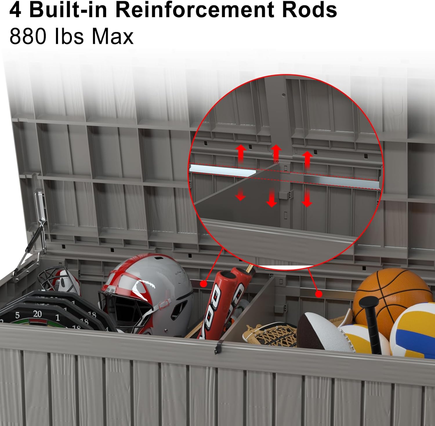 - Hydraulic Support for Easy Lid Opening:Equipped with hydraulic support, this deck box lid opens smoothly and stays open, providing easy access to your stored items. No need to struggle with heavy lids anymore.