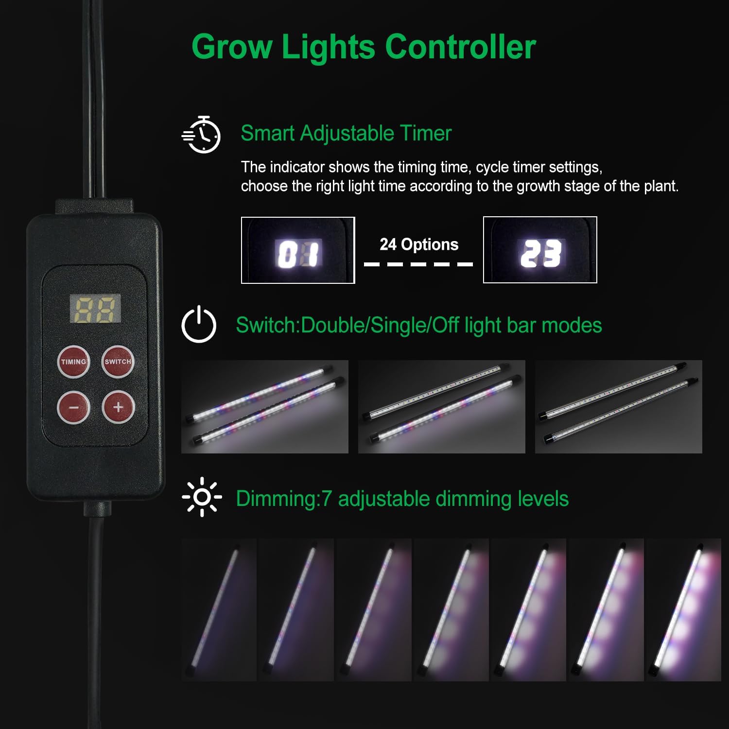 - 1- 23 Timing Functions: The latest timer design allows you to choose a run time of 1-23 hours, unlike only three timing functions on the market. By maintaining adequate light time, your seedlings will grow stronger, faster and healthier.