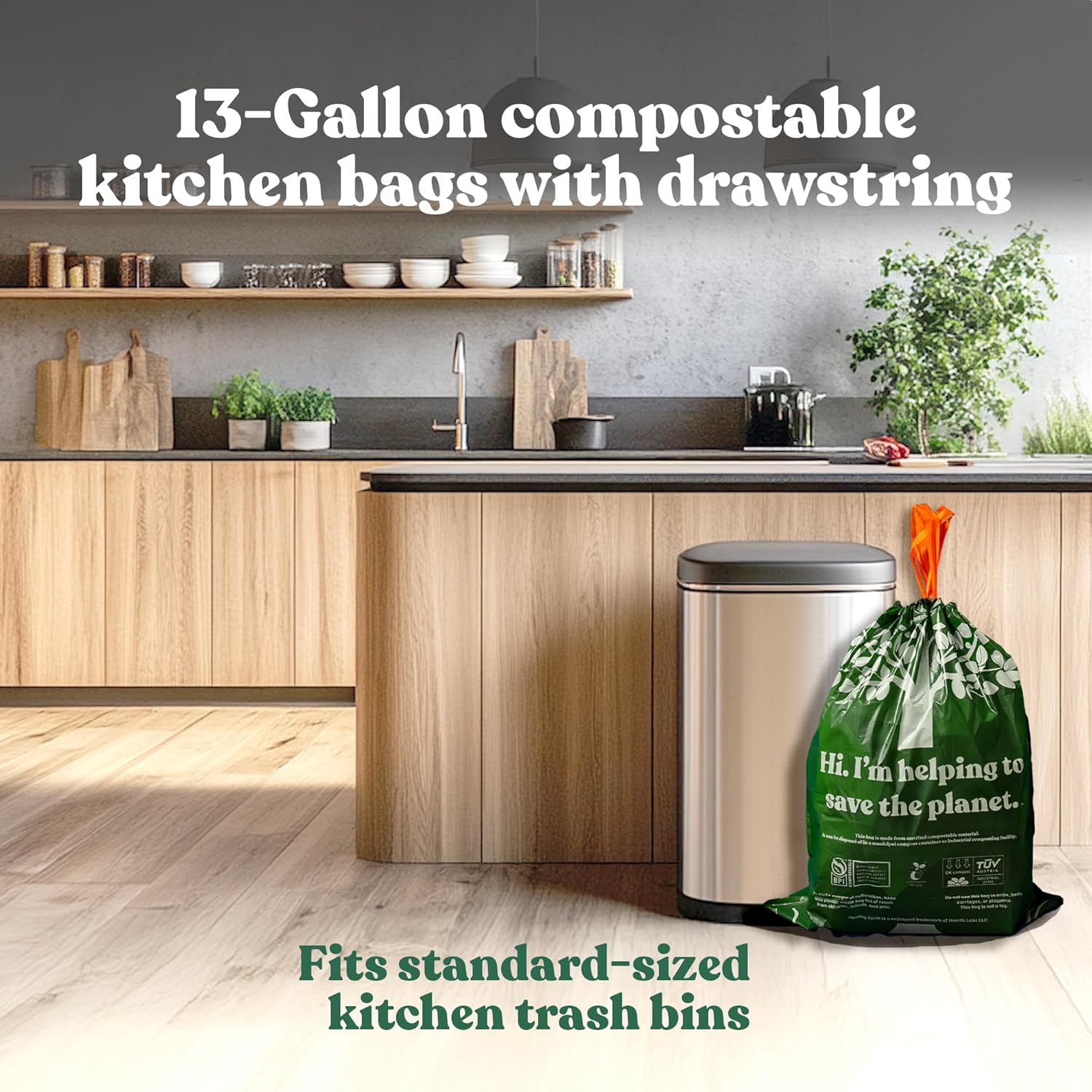 Healthy Earth 13 Gallon Compostable Trash Bags – Tall Kitchen Garbage Bags with Drawstring Handles, Extra Thick Plant-Based Liners, BPI & TÜV Certified ASTM D6400, Heavy Duty Leak-Proof (60 Count)