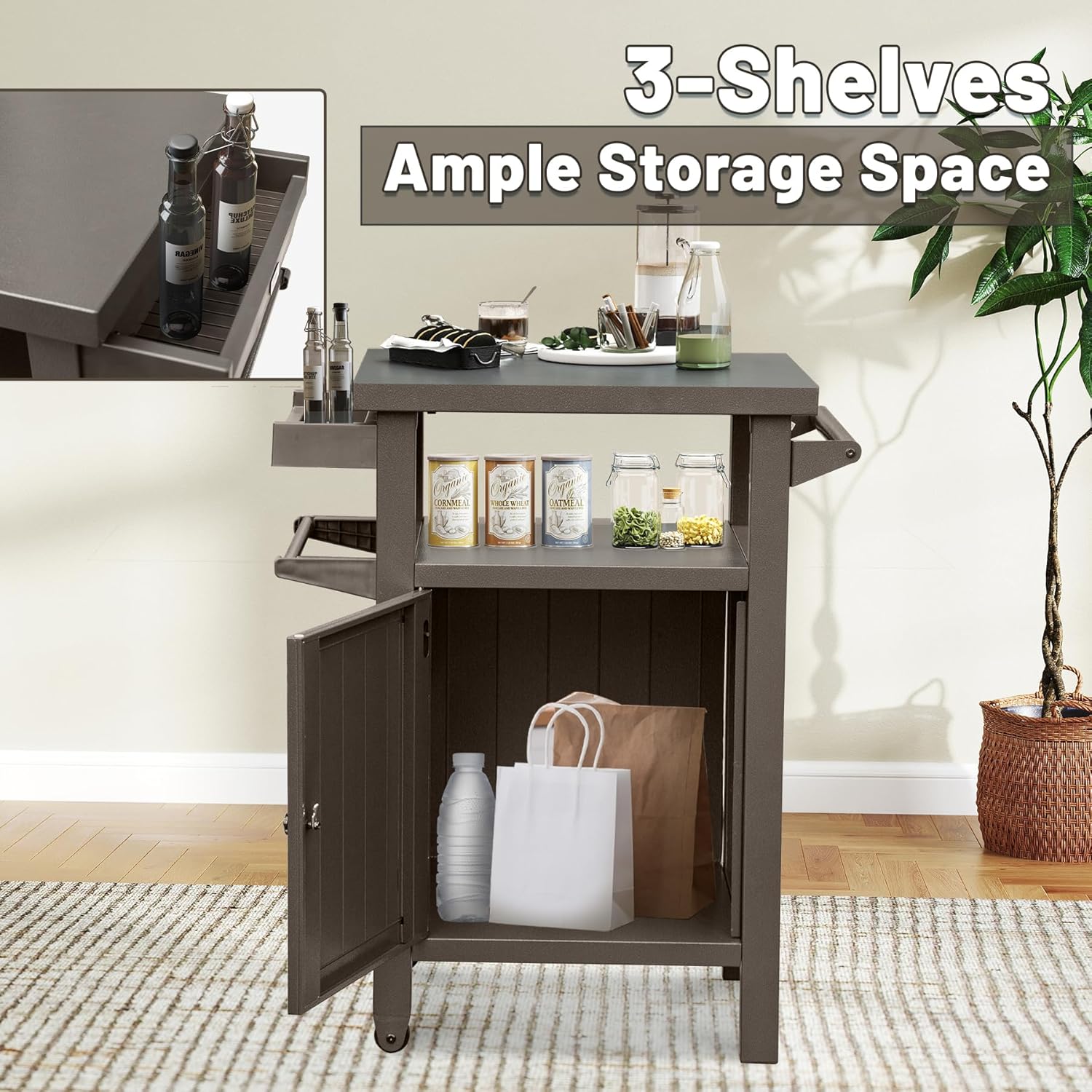 Grill Cart Outdoor with Storage Cabinet, Portable Rolling Patio Bar Cart with Wheels, BBQ Prep Table, Movable Stainless Steel Kitchen Island Dining Cart for Food/Drink/Cooking -Brown