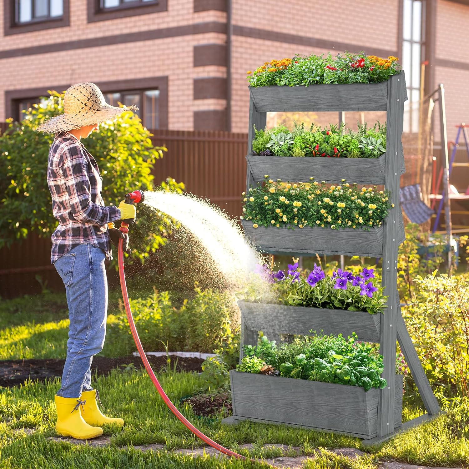 - Five-Layered Garden Design: This planter box features a five-tier structure, allowing you to cultivate a variety of plants in separate layers. You can plant everything from vegetables and herbs to flowers, fruits, and even strawberries. Each tier offers ample space for healthy growth without overcrowding your plants