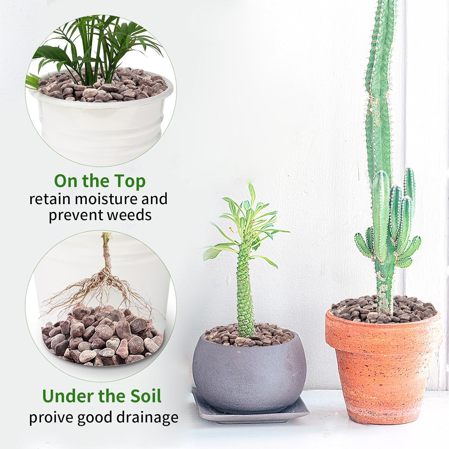 - 【Pebbles for Indoor Plants】Small pebbles can be used on top of plants to decorate succulents and to keep soil from flying everywhere when watering. Used at the bottom, they provide good drainage and prevent root rot and overwatering
