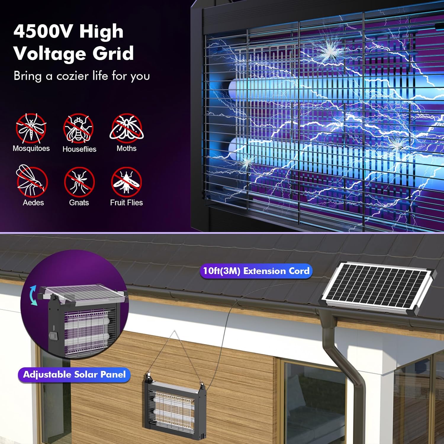 - Safety-First Design: Our electric bug zapper indoor uses pure, physical mosquito control —no sprays or smell. The durable ABS housing and protective mesh shield prevent accidental contact with the high-voltage grid, ensuring safety for kids and pets. Adjustable solar panel and extension cable allow for optimal placement of the fly killer in homes, patios, and beyond