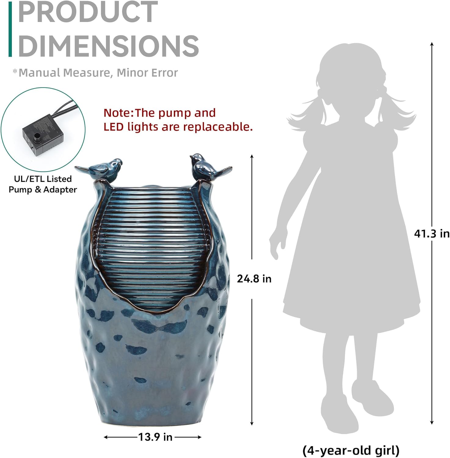 24.8" H Ceramic Jar Outdoor Water Fountain with LED Lights & Bird Accents, Elegant Turquoise Glaze with Bubble-Like Texture, Decorative Garden Water Feature