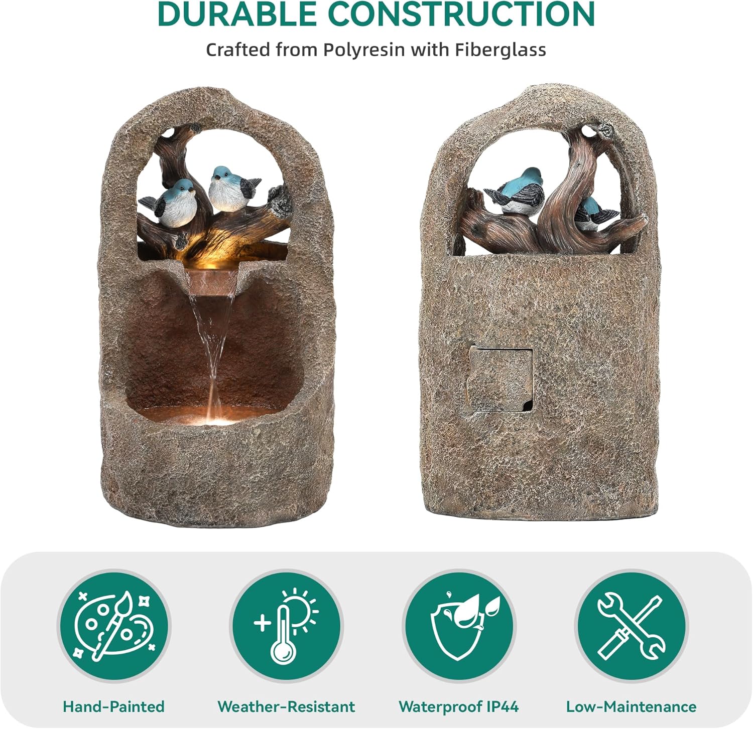 27" 2-Tier Bird Outdoor Water Fountain with Lights, Natural Zen Garden Fountain, Relaxing Waterfall Floor, Yard, Porch or Deck Decor, Whether-Resistant, Faux Granite Texture