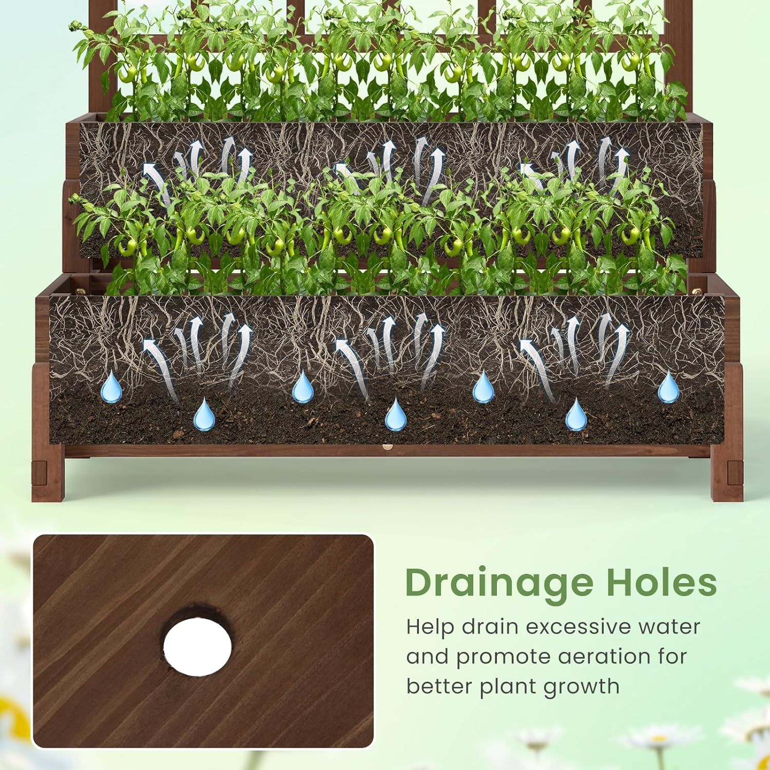 - Multifunctional Lattice Trellis: The elevated garden bed is equipped with a lattice trellis to support climbing plants, keeping them growing upwards gracefully. Additionally, the trellis serves as a charming mount for hanging small flower baskets or decorative ornaments.