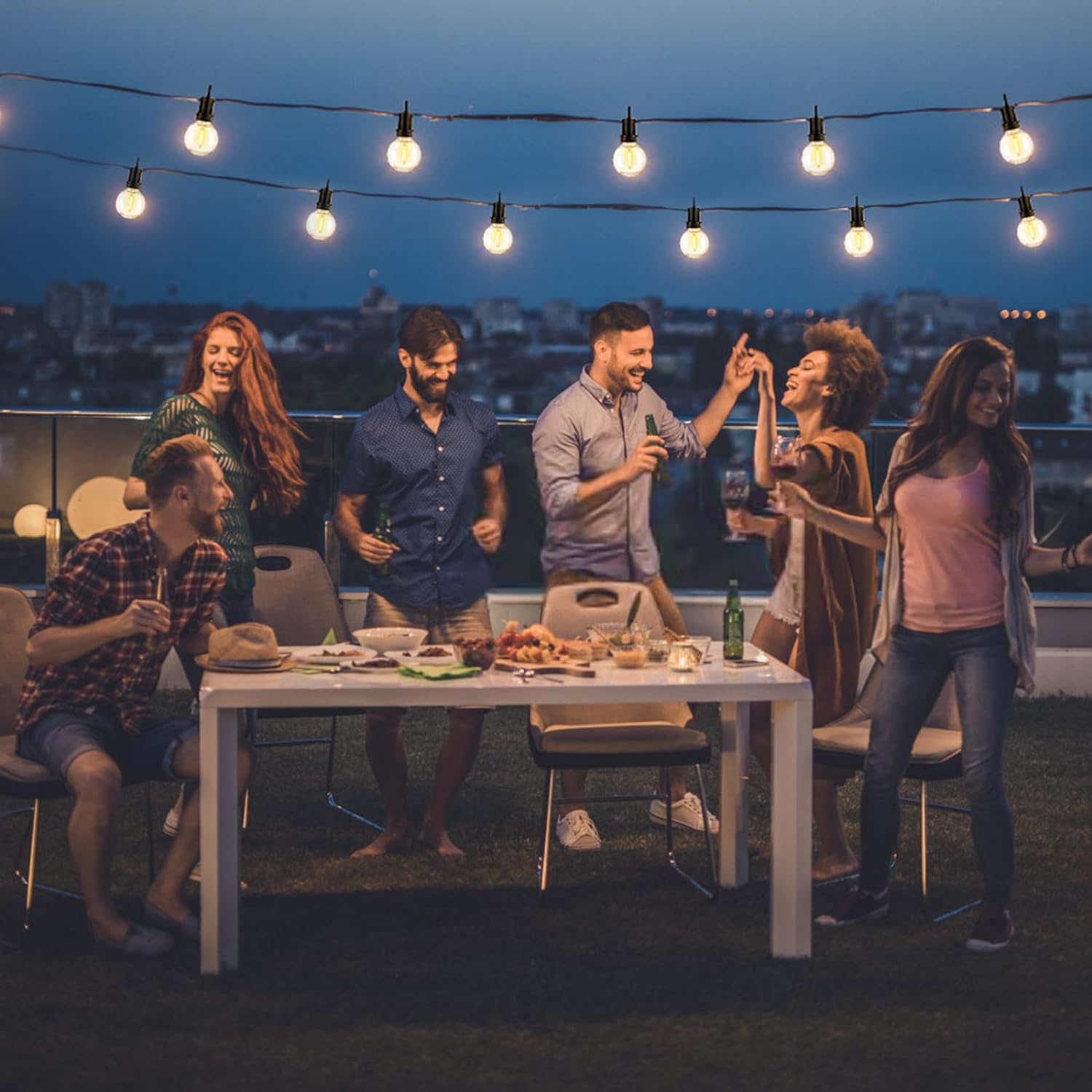 - 【Exclusive Teardrop Style Ambiance Gift-Remote Control】Outdoor string lights solar powered 2700K warm soft white light create bistro cafe bars relaxing and Warm and cozy ambiance at your deck yard backyard garden when eating dinner /talking with friends,also when singing and dancing at the social activity using the Remote Control 4 models(Steady On/Flash Slowly/Flash Rapidly/Intermittent Flashes) and 5 brightness levels (20/40/60/80/100%) to enjoy party better.