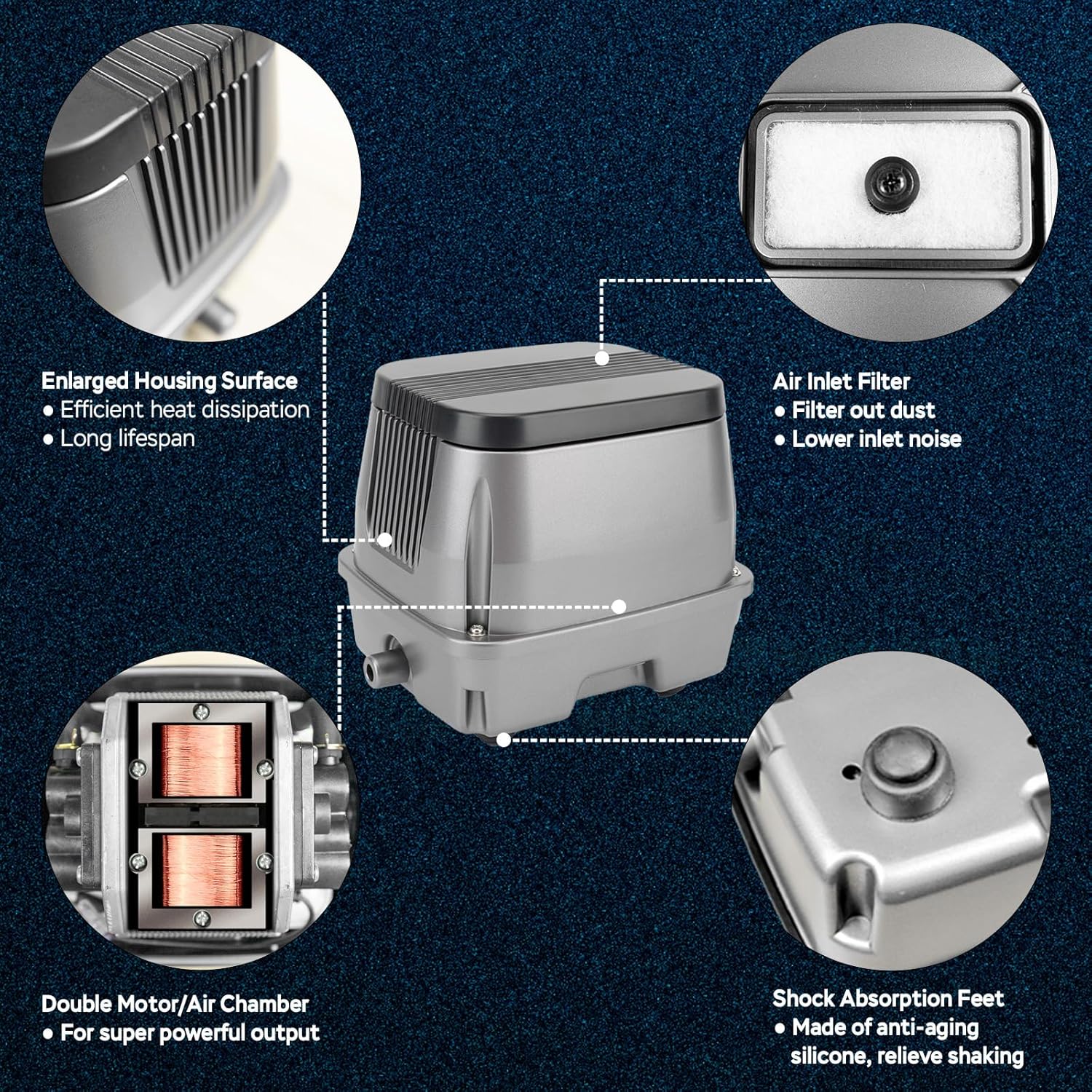 - GREAT HEAT DISSIPATION - The enlarged housing and optimized design of this septic air pump ensure superior heat dissipation, preventing overheating even during 24/7 operation. Keeps internal components at lower temperatures to extend pump life.