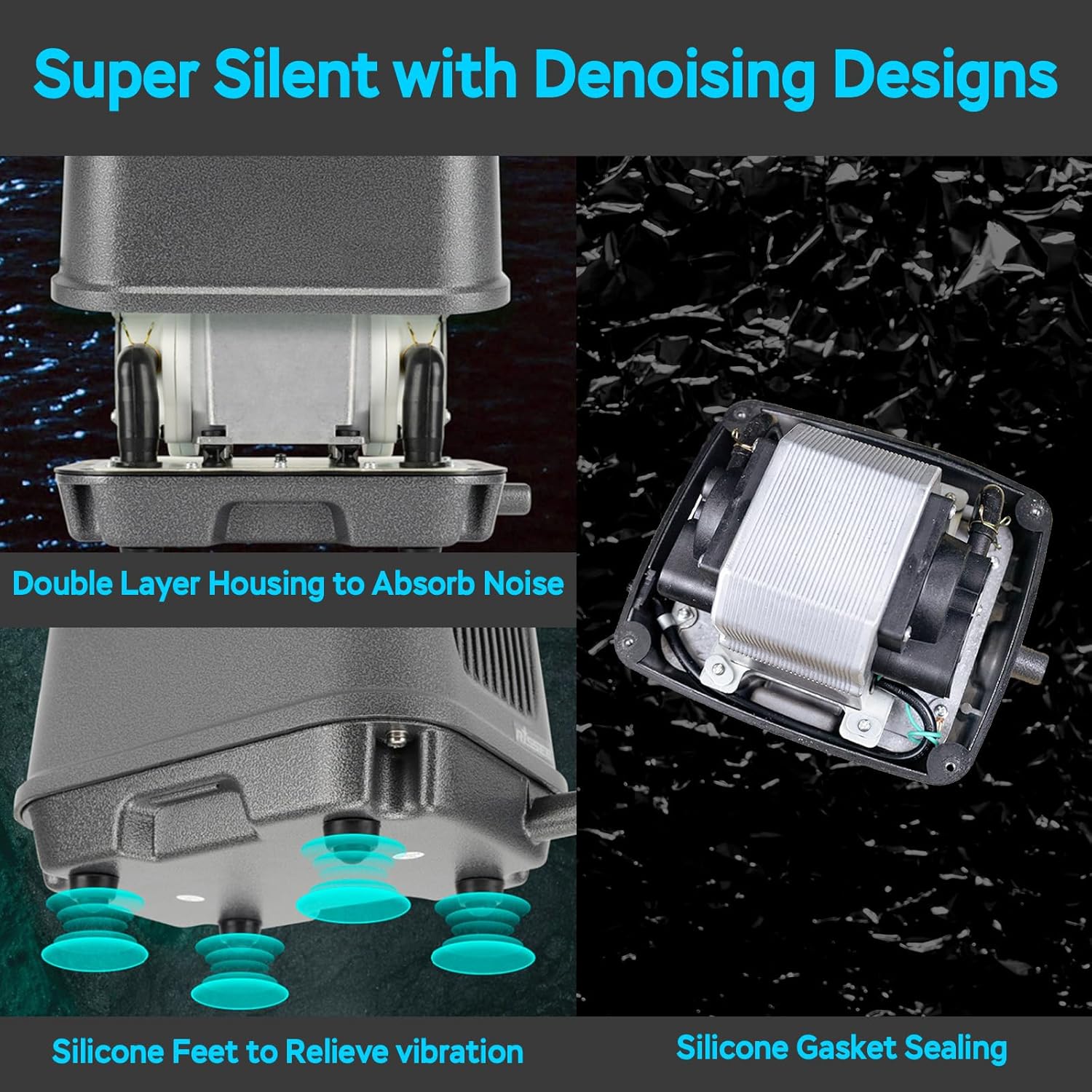 - SPECIFICATION - This linear air pump delivers a max of 1600GPH powerful airflow at 0.035MPa pressure with an 60W energy-efficient copper coil motor that runs in stable operation and lasts longer. Perfect as a pond aerator, septic aerator, hydroponic air pump, or aquarium air pump, it provides high efficiency, low heat and low power consumption.