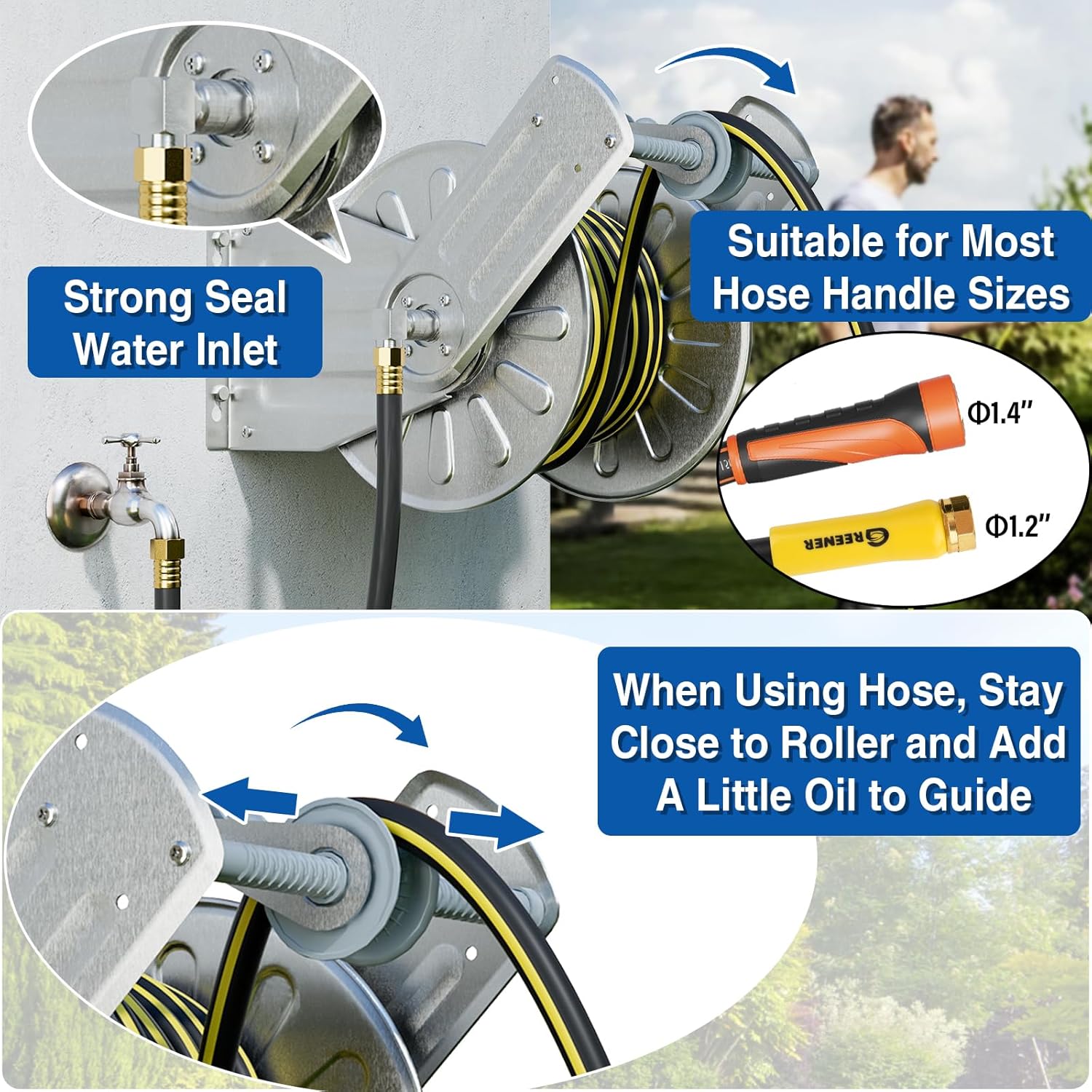 - HASSLE-FREE OPERATION - Say goodbye to tangled hoses and messy buildup! The GREENER garden hose reel wall mount comes with a hose auto-guide, Rubber-covered sharp edges and a Trimmable-length hose protector to ensure smooth, easy reeling, extending the life of your hose, saving you time and worry. Enjoy the convenience of a retractable hose that won't tangle or kink.