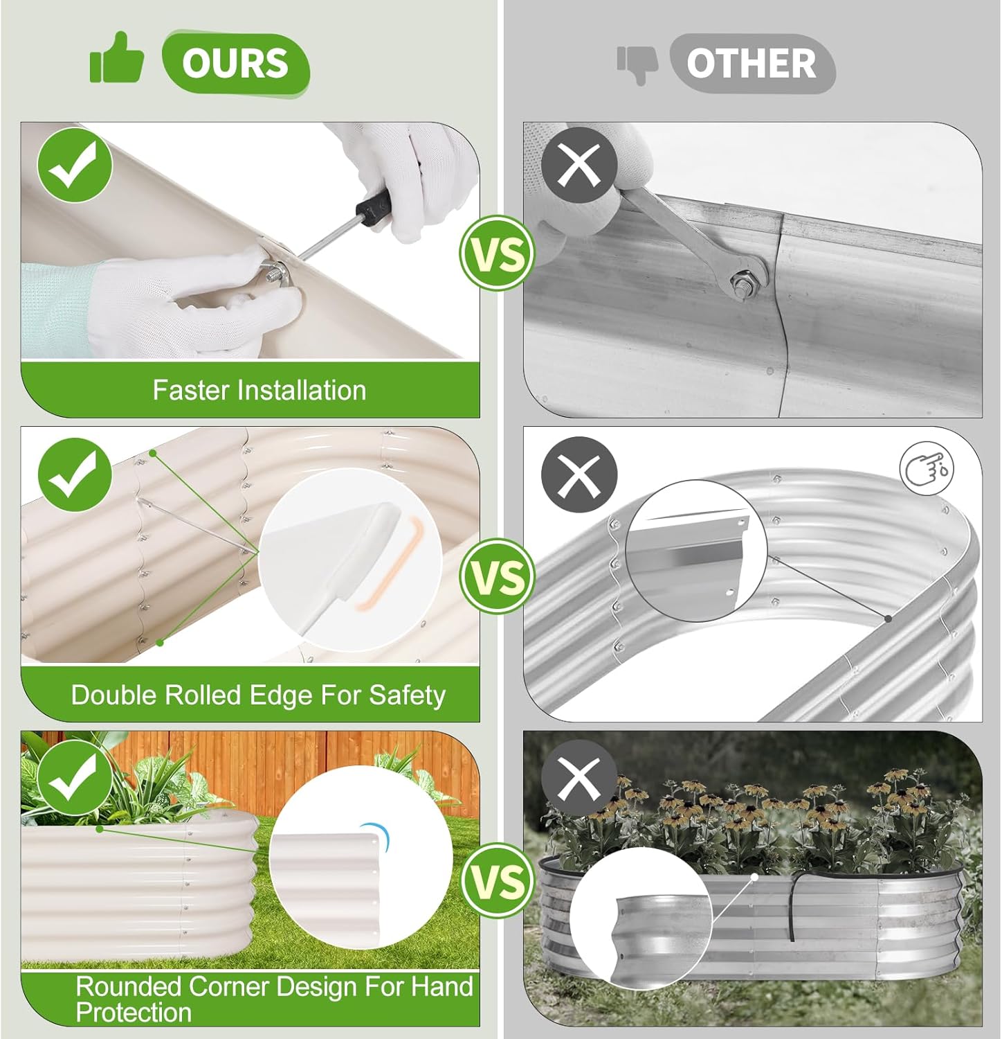 - 【Safe Edge Design】 The garden box features a folded design that eliminates sharp edges, ensuring safe installation. With rounded corners for additional hand protection, it offers dual safety, making it perfect for homes with children and pets