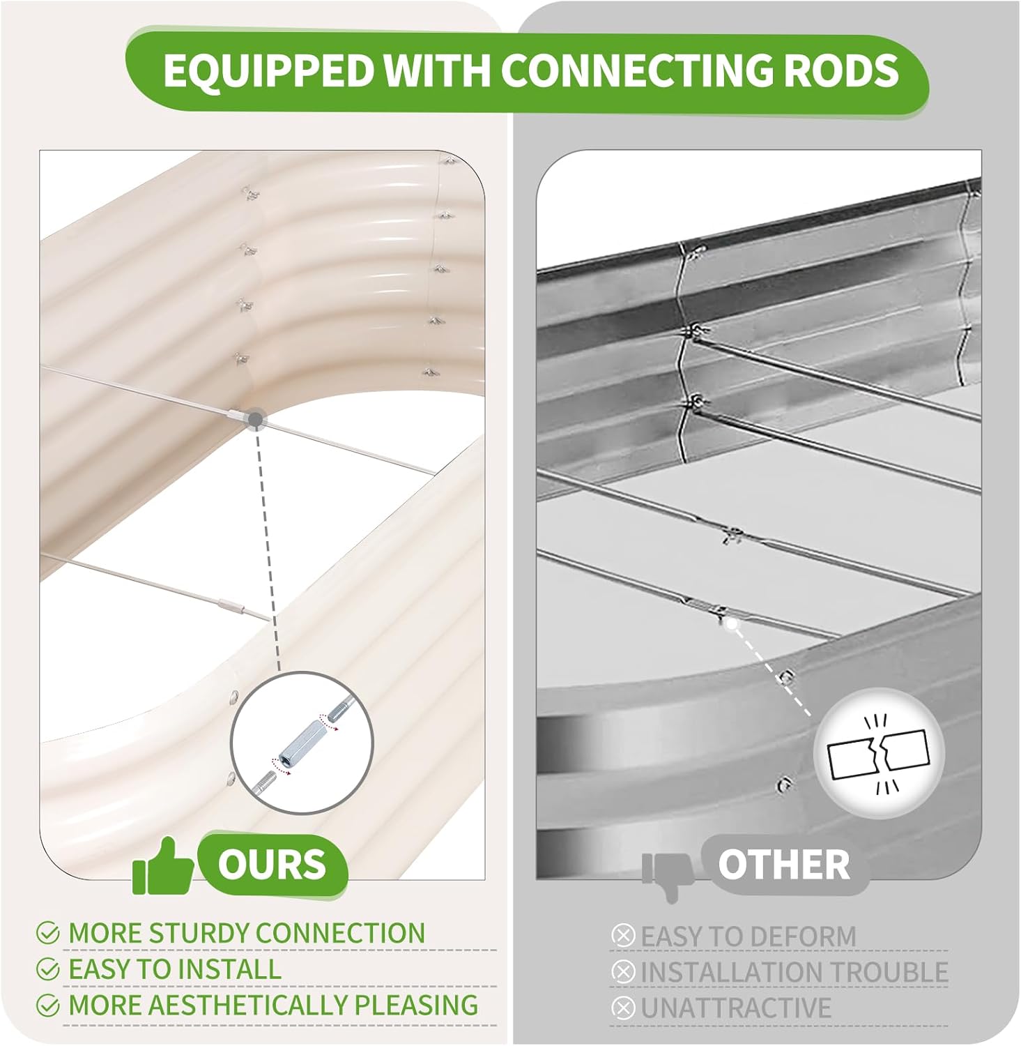 - 【Upgrade Quality & Structure 】The raised garden bed is made of thick galvanized metal with a surface spray coating, which is rust proof and anti-corrosion. Can be used for a long time. The oval design ensures uniform surface force and prevents deformation. More durable than other raised planter box, becoming a good helper for your garden