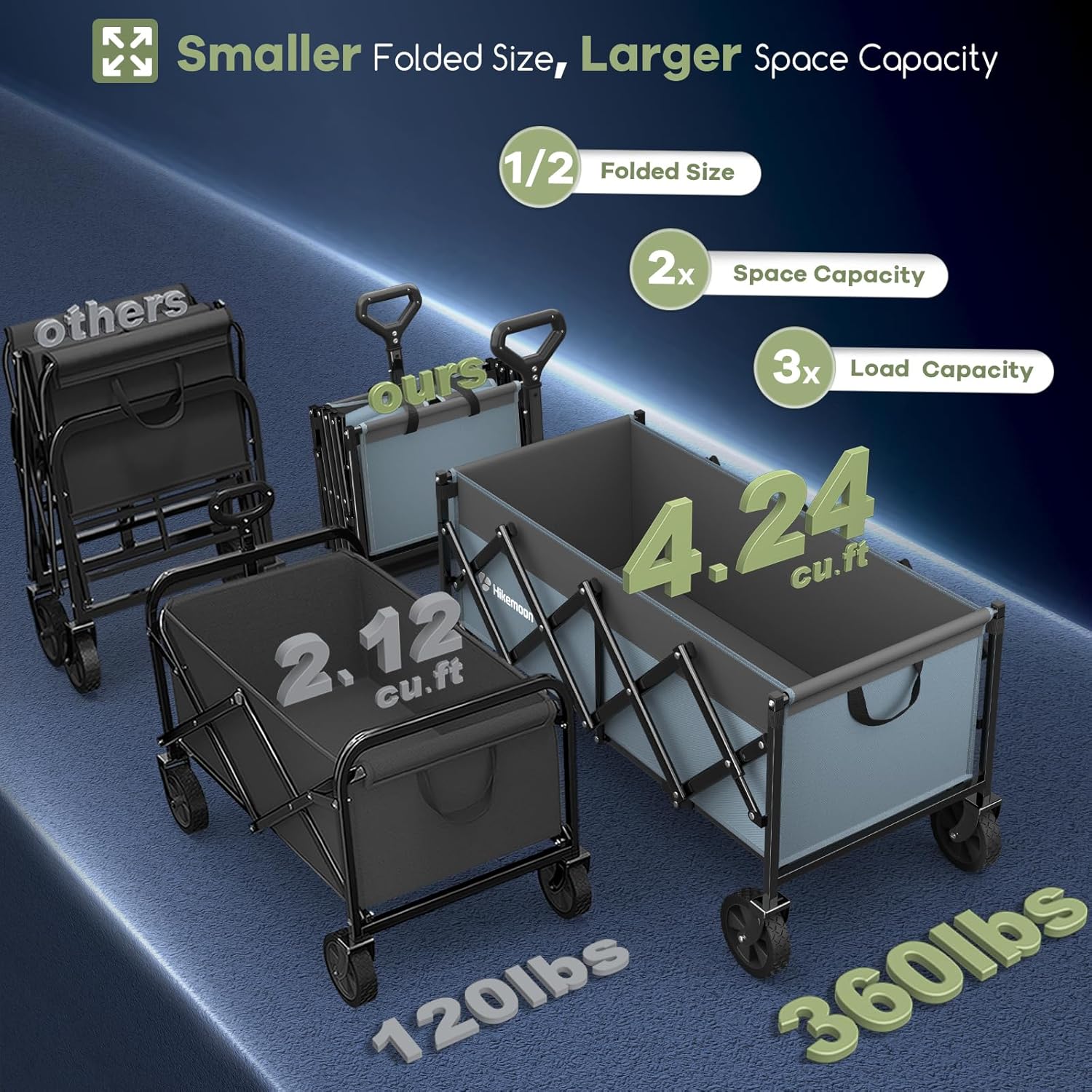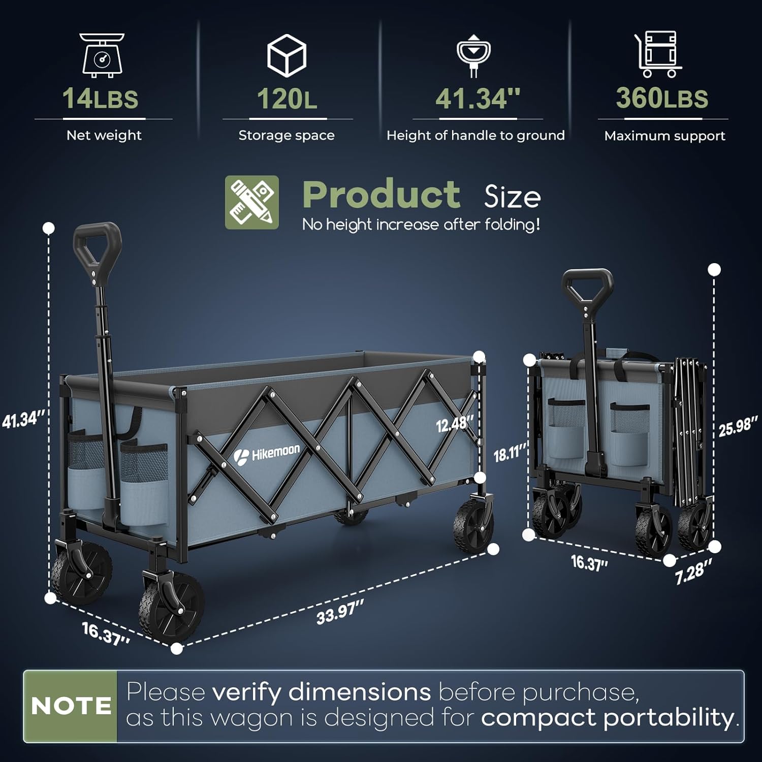 - 【𝟑𝟒" 𝐄𝐱𝐭𝐫𝐚 𝐋𝐨𝐧𝐠 𝐋𝐢𝐠𝐡𝐭𝐰𝐞𝐢𝐠𝐡𝐭 𝐖𝐚𝐠𝐨𝐧 𝐰𝐢𝐭𝐡 𝟏𝟐𝟎𝐋 𝐂𝐚𝐩𝐚𝐜𝐢𝐭𝐲】: Featuring a patented design, this wagon is 50% longer than standard wagons. Its spacious interior easily accommodates long items like folded tents. Despite its large capacity, it weighs only 14 lbs, making it 40% lighter than other wagons! You can carry this portable wagon effortlessly.