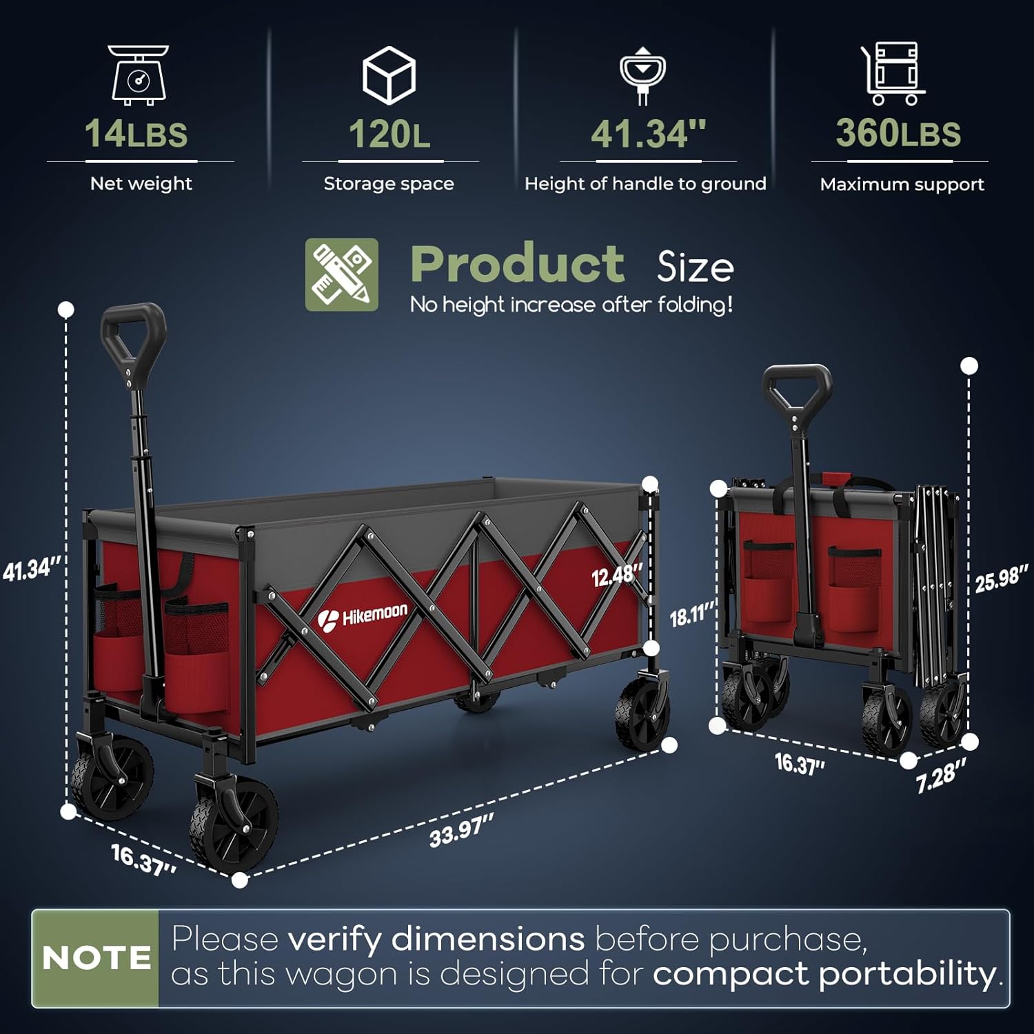- 【𝟑𝟒" 𝐄𝐱𝐭𝐫𝐚 𝐋𝐨𝐧𝐠 𝐋𝐢𝐠𝐡𝐭𝐰𝐞𝐢𝐠𝐡𝐭 𝐖𝐚𝐠𝐨𝐧 𝐰𝐢𝐭𝐡 𝟏𝟐𝟎𝐋 𝐂𝐚𝐩𝐚𝐜𝐢𝐭𝐲】: Featuring a patented design, this wagon is 50% longer than standard wagons. Its spacious interior easily accommodates long items like folded tents. Despite its large capacity, it weighs only 14 lbs, making it 40% lighter than other wagons! You can carry this portable wagon effortlessly.