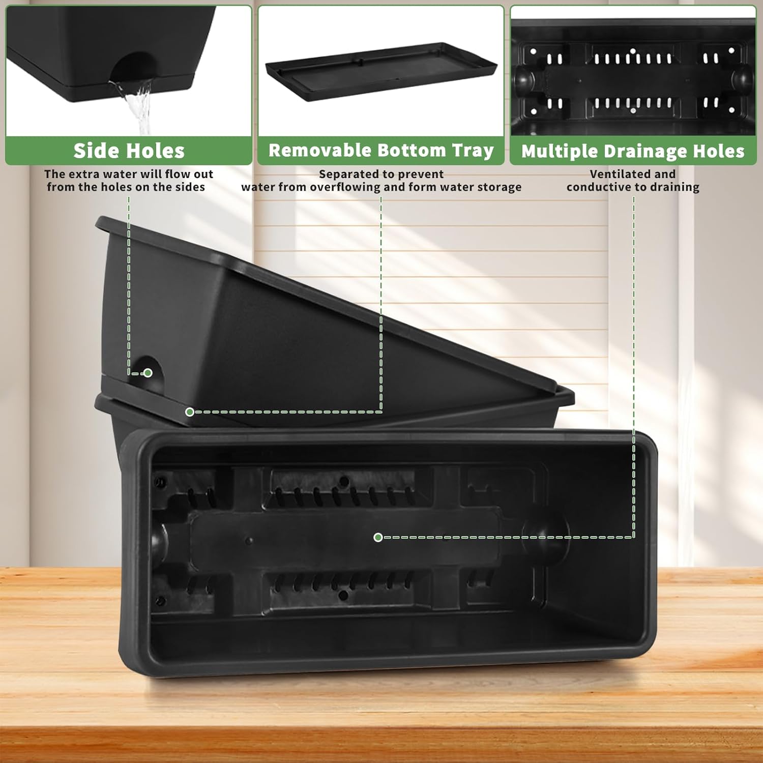 - Water Storage & Drainage Design: The drainage system of the hanging planter box features breathable drainage design ,ensures proper water management ,as each box has bottom holes for drainage ,a tray to collect water to prevent root rot while storing the proper amount of water to maintain perfect humidity levels for healthy plant growth