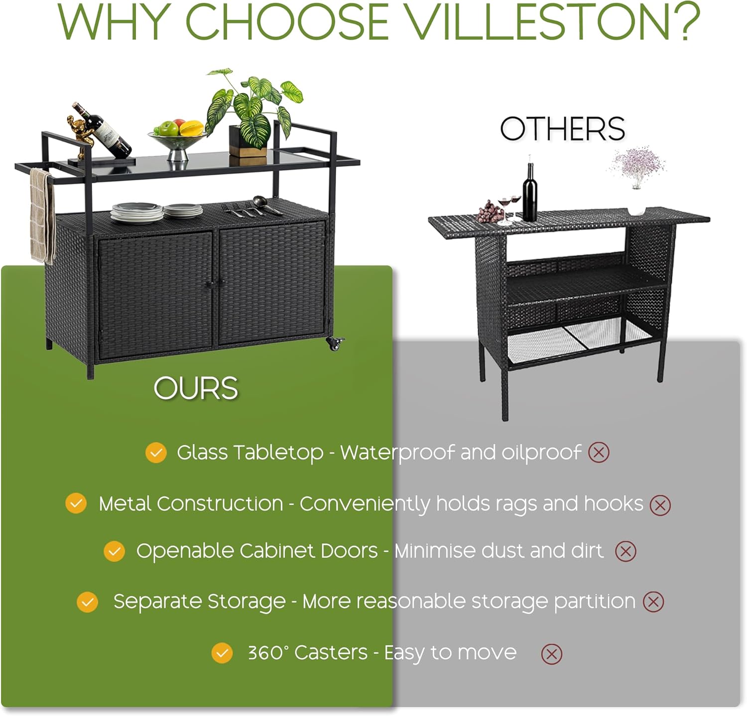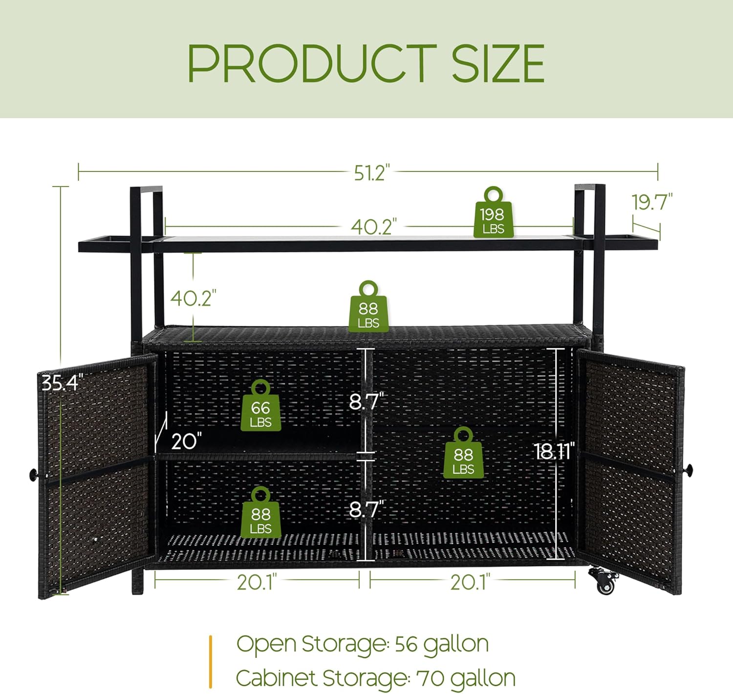 - SPACIOUS RATTAN CABINET: Stay organized with cabinet cart, which includes a large storage cabinet with two magnetic doors. This enclosed outdoor storage cart keeps grilling tools, bar essentials, and outdoor accessories neatly stored