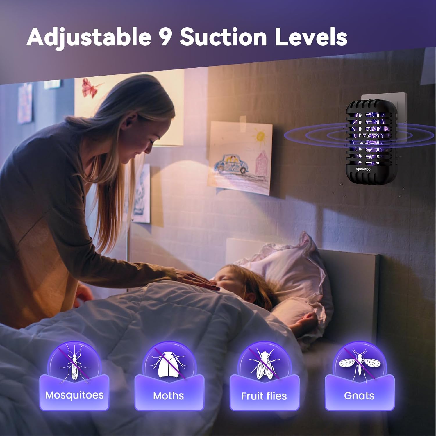 - 👏Easy to Use: One-button switch, plug and play, you no longer have to worry about being bitten by mosquitoes when the mosquito zapper runs out of power at night. It can be used in many scenes, such as the living room, bedroom, garage, etc.