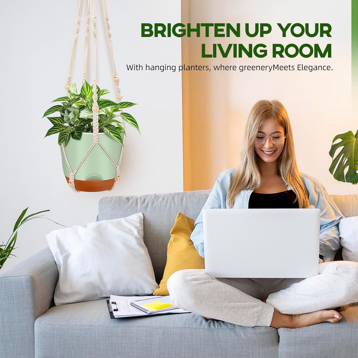 2-Pack 7.2-Inch Self-Watering Hanging Planters for Indoor & Outdoor Plants,34-Inch macrame hanger plant pots indoor with drainage,Small Hanging Planters & Baskets in Green,With two sets of hooks