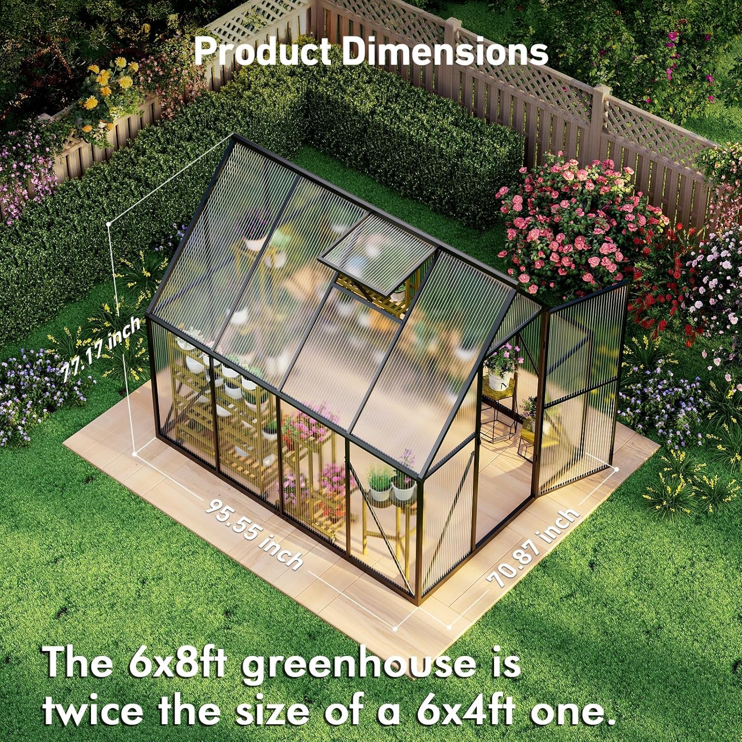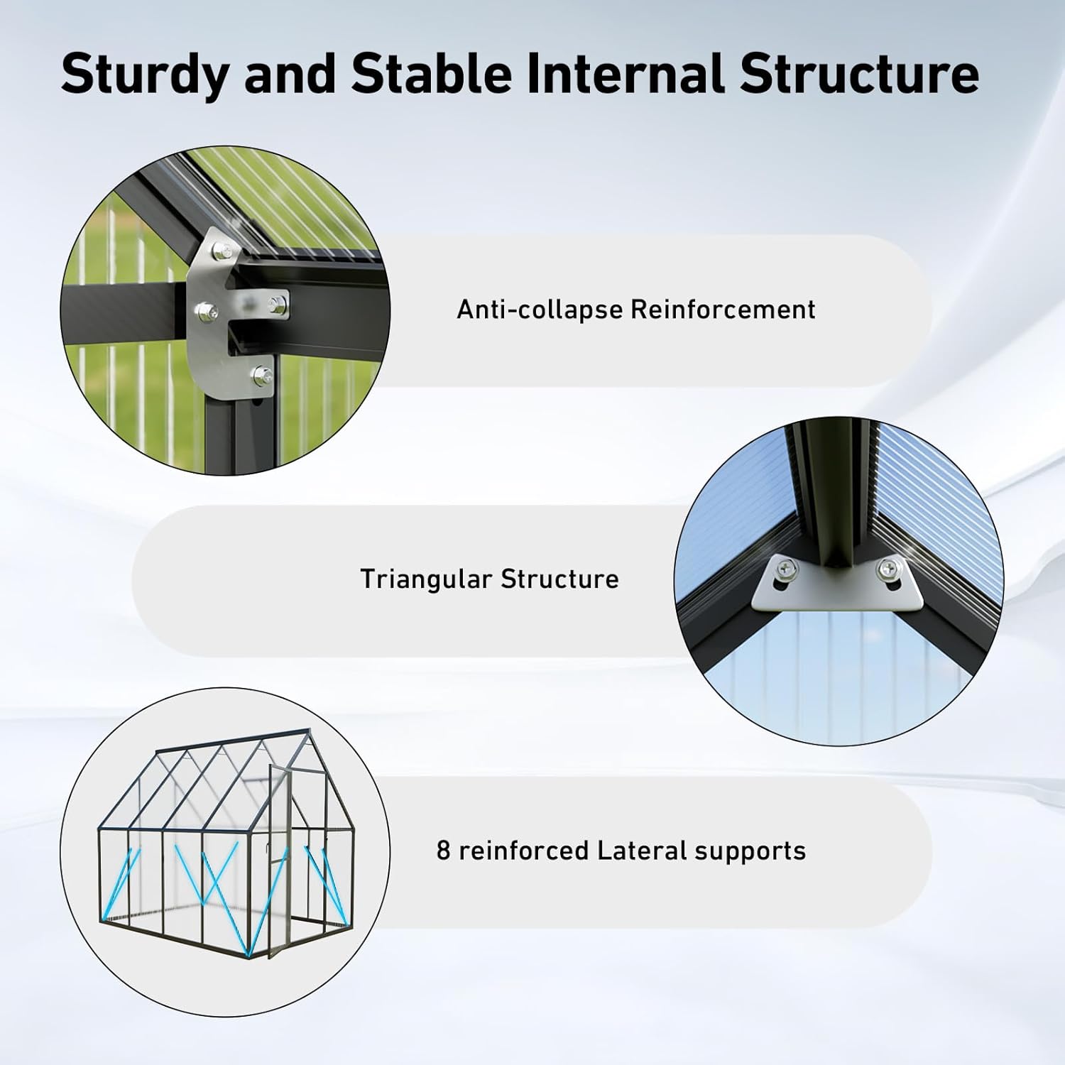 - Durable & Stable Structure-This polycarbonate greenhouse is built with a high-quality reinforced aluminum alloy frame and strengthened corners for excellent stability. Designed to handle tough outdoor conditions like strong winds, heavy rain, and snow. For added strength, you can seal the panel gaps with silicone (not included), making it a reliable green house for year-round use.
