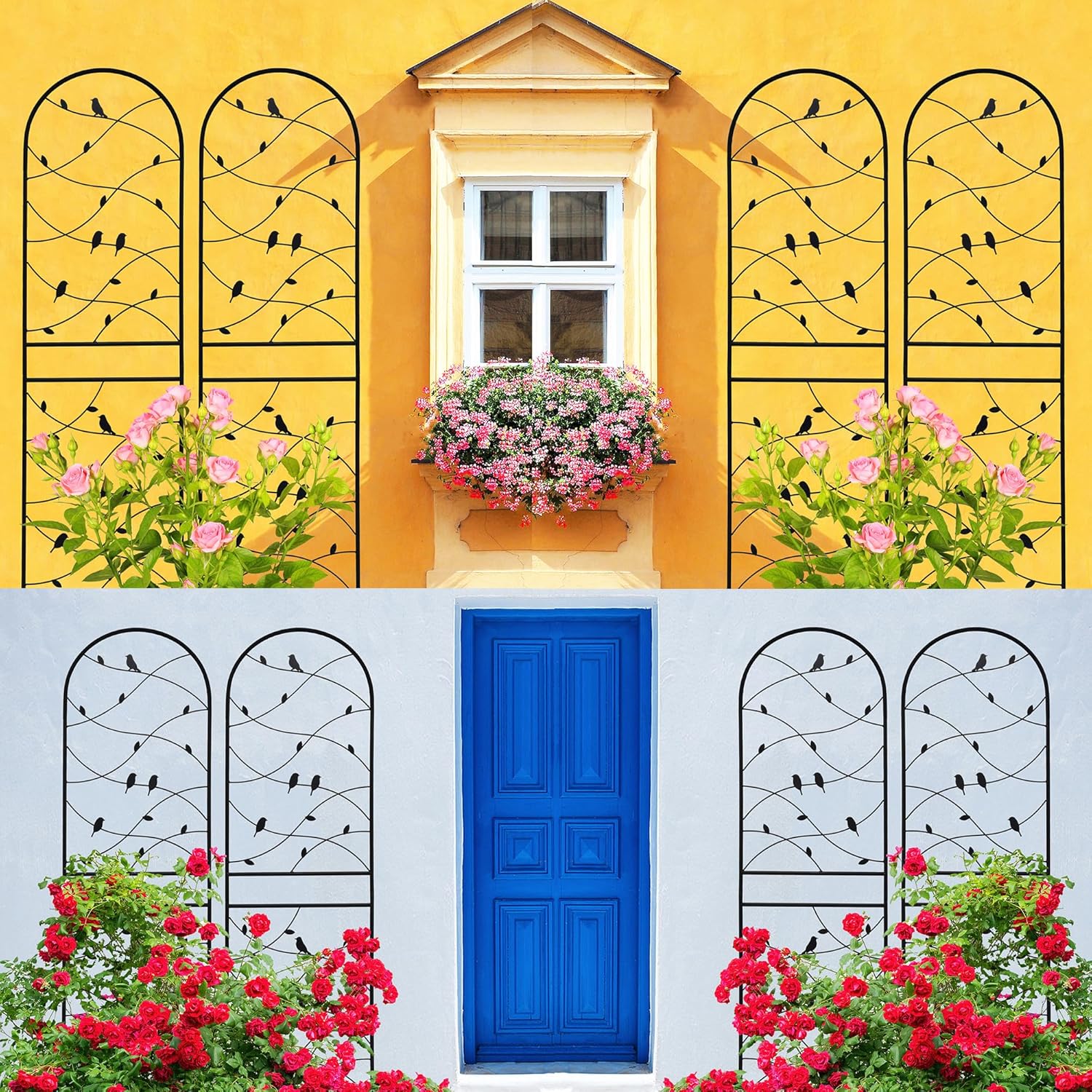 - Multi-purpose Metal Garden Trellis: This outdoor garden trellis is perfect for supporting all kinds of flowering trellis plants, wall-climbing vines, cucumber, grape,etc. It allows them to grow naturally up towards the top.