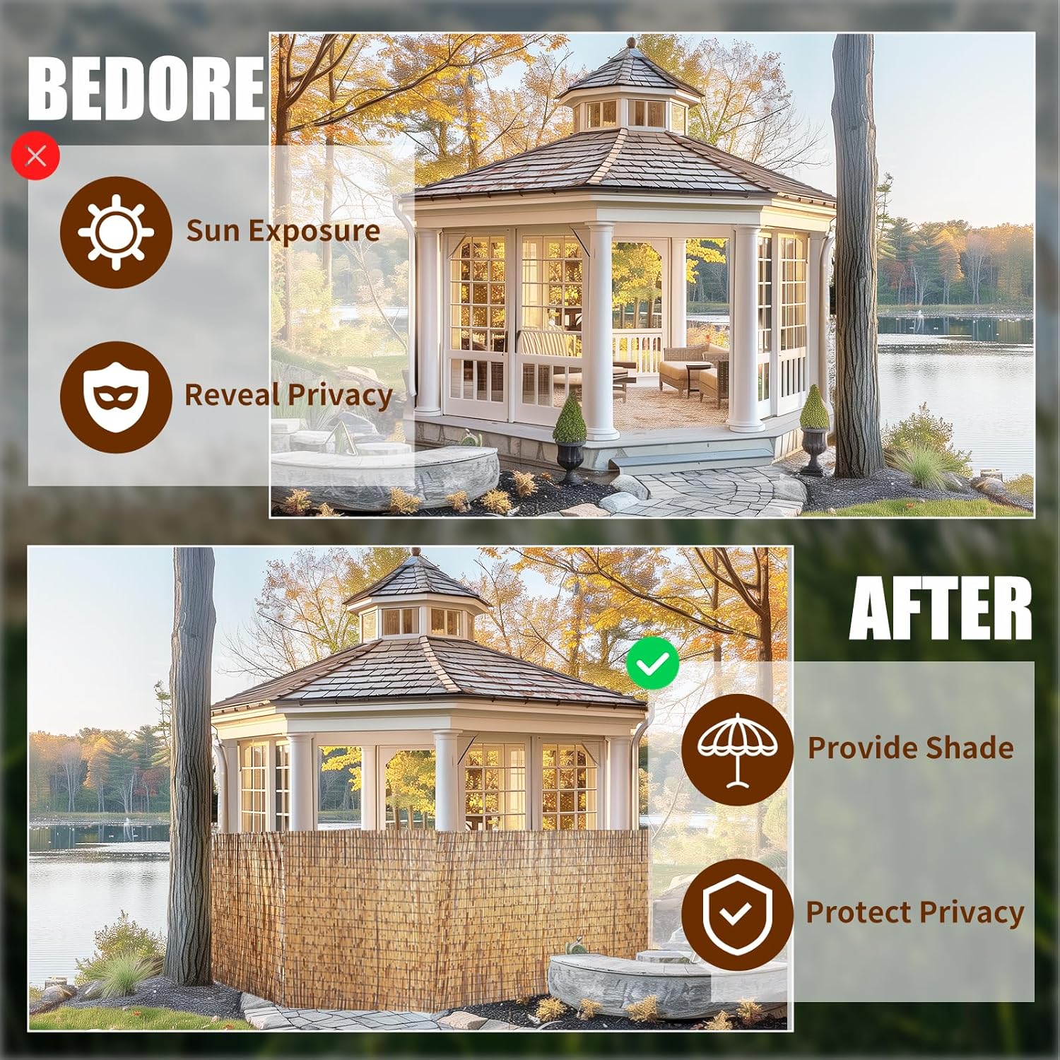 - Use:Use as a fence, sunshade, suitable for patios, balconies, offices, decks, sunrooms, cafes, gazebos, garages, galleries, pool decorations, or put it on the exterior wall of the house for insulation purposes. A perfect environmentally friendly alternative to other wood products. Commercial and residential indoor or outdoor environments.