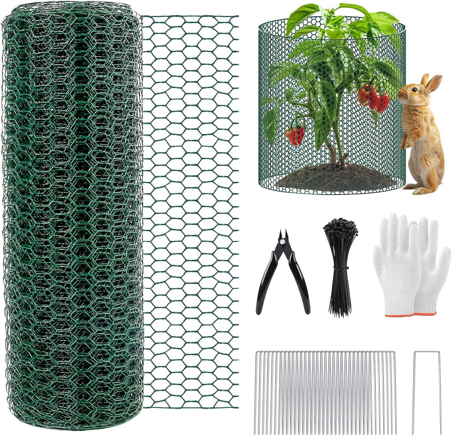 39.4Ft x 16In Plant Protectors from Animals, Plant Cages for Outdoor Plants, Free-Cut Metal Mesh Plant Covers Guards Fence Chicken Wire Cloche with Ground Stakes & Ties to Keeping Bunny Animals Out