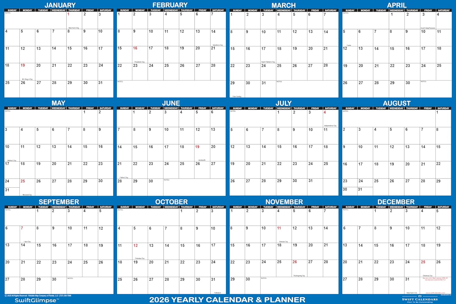 - LARGE 2026 CALENDAR BLOCKS: Each Wall Calendar features large blocks for scheduling and notes. Vertical side blocks are 1.5" x 1.25" - Horizontal side blocks are 1.25" x 1.25". Bold and large print with bright white background allows for easier viewing and reading at-a-glance.