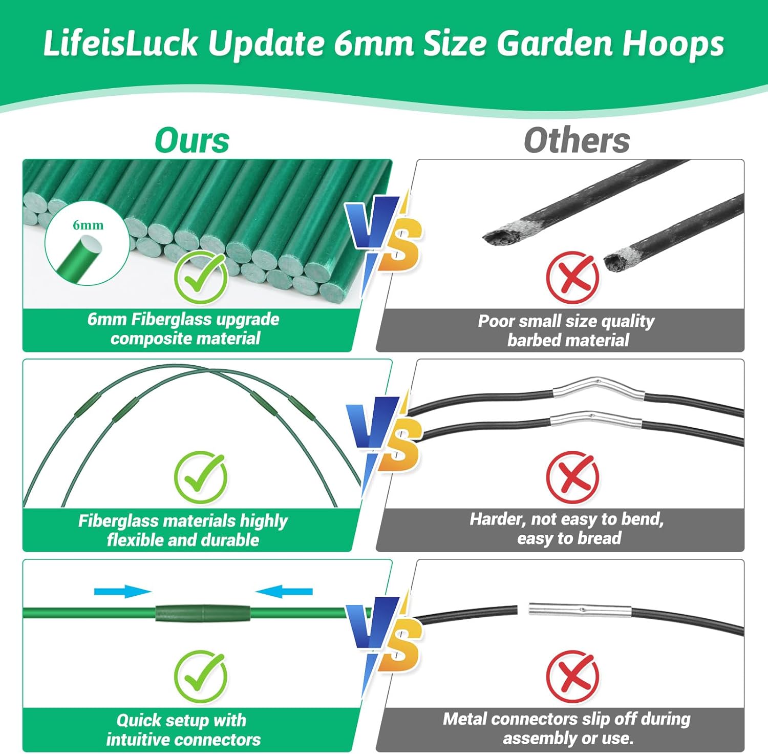 - Durable and Versatile Construction: Garden hoops crafted from friendly and heavy-duty fiberglass material, our garden bed hoops ensure long-lasting performance. These rust-free hoops boast exceptional flexibility and resilience, offering strong resistance against environmental factors. With anti-oxidation properties, they guarantee enduring support for your garden beds in all seasons.