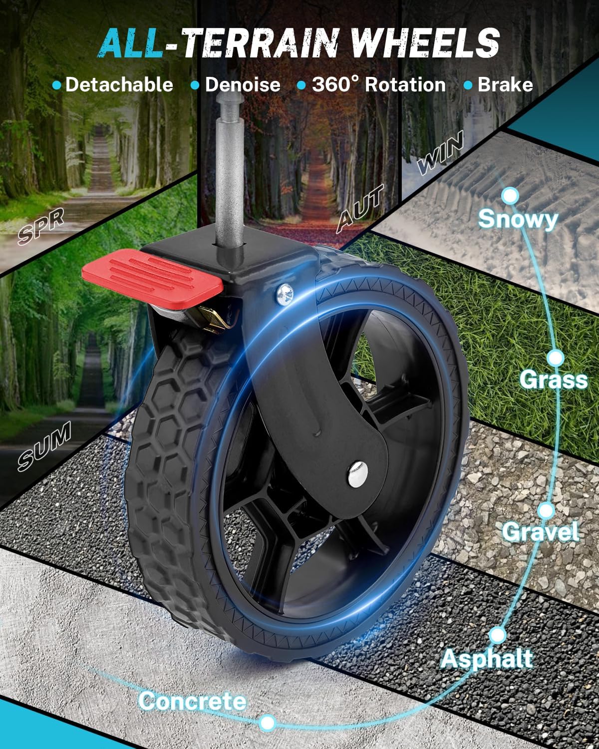 - 【360° Rotation All-Terrain Wheels】This collapsible wagon has 4 removable wheels. The adjustable handle extends up to 39" to adapt to different heights, and the front wheels can rotate 360°. And it smoothly traverses cobblestones, grass, beaches, and asphalt