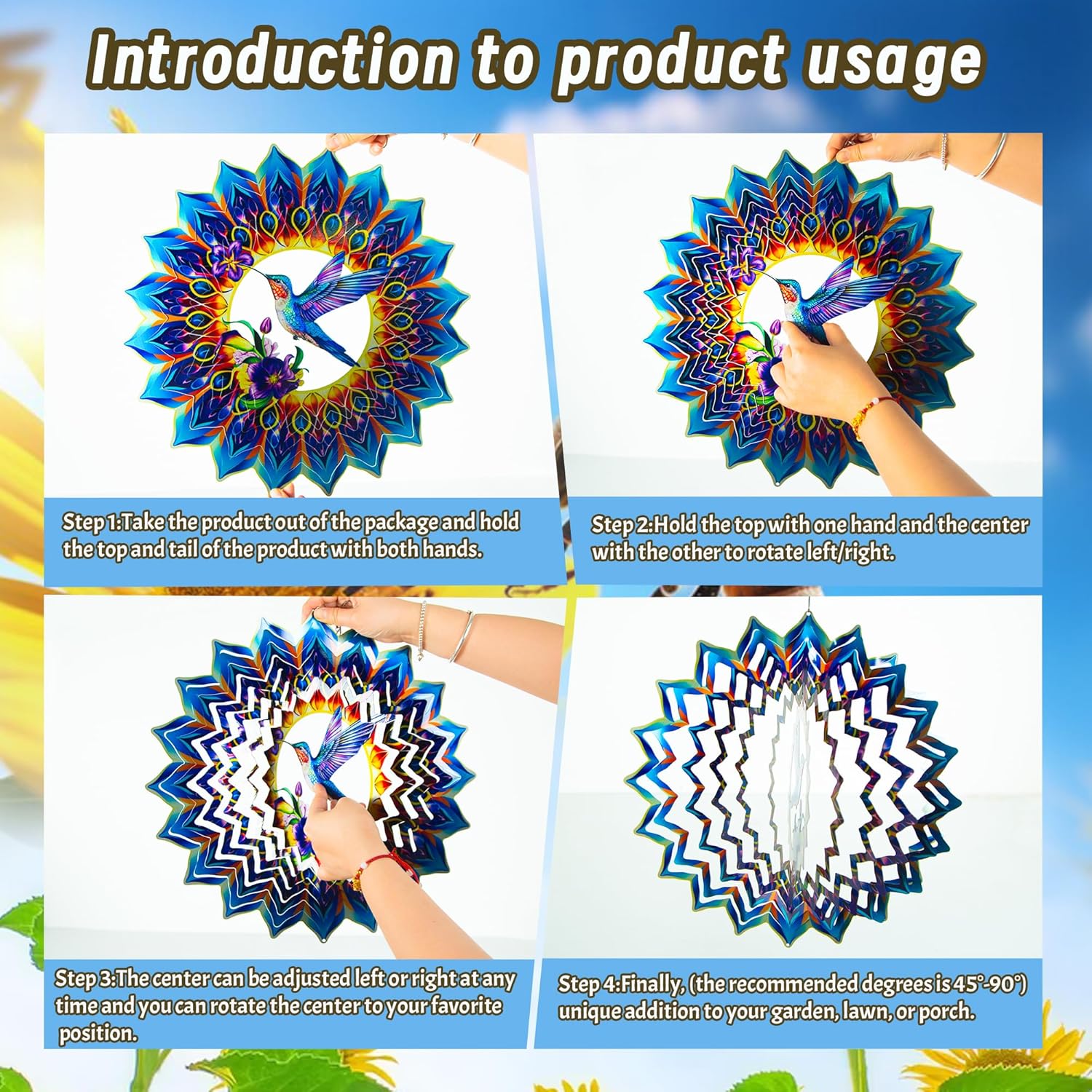 - 【Instructions for Use】: Remove the spinner from the package, hold the top with one hand and the center with the other. Gently twist the layers left or right until it reaches your desired 3D shape. Then, simply hang it up and let the wind do the rest.