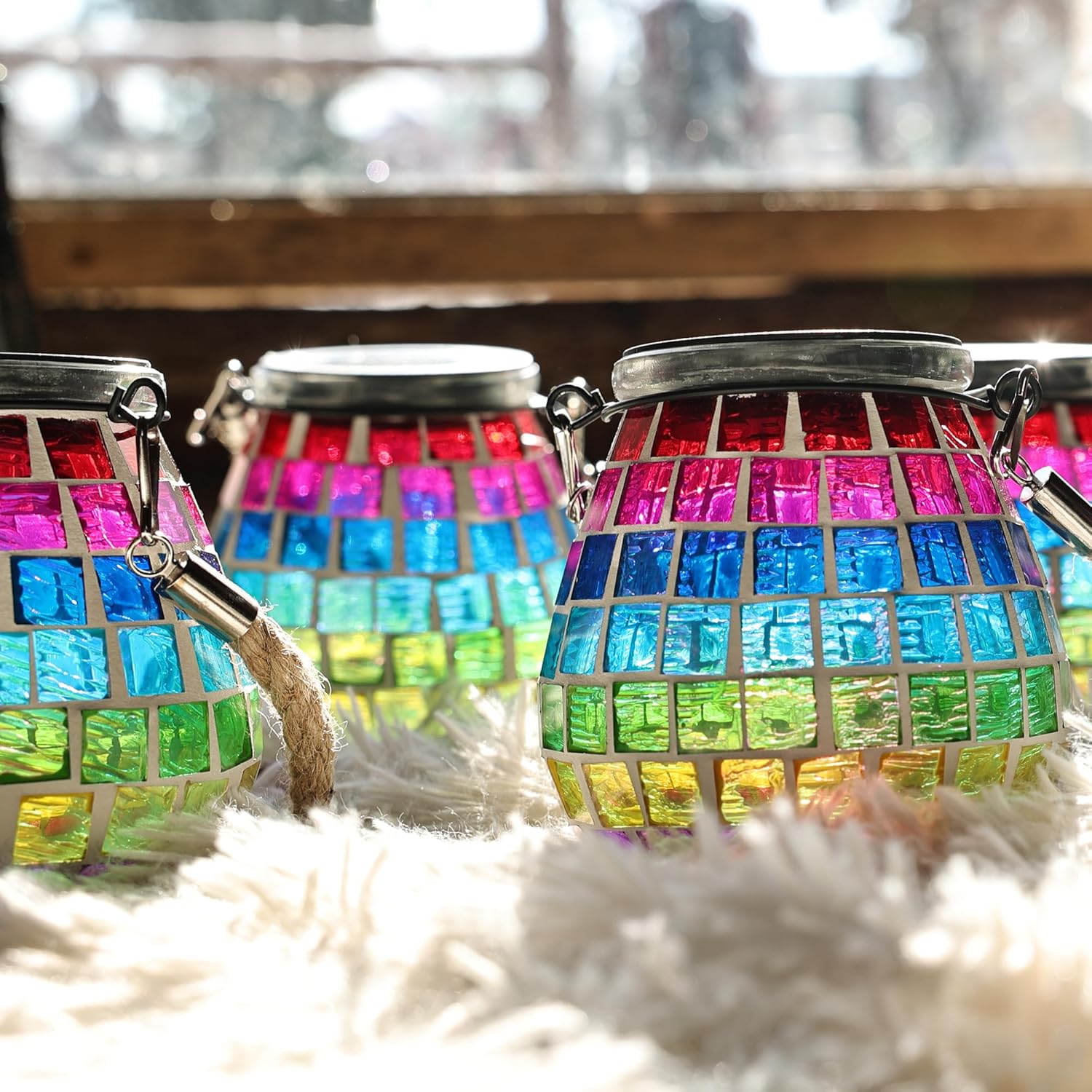 Cooo 4 Pack Mosaic Solar Lantern Outdoor Waterproof IP68 Hanging Projection Light Hidden Lid Pear-Shaped Lantern with Rope Handle Solar Powered Auto On for Patio Garden Fence Table - Neon Mosaic