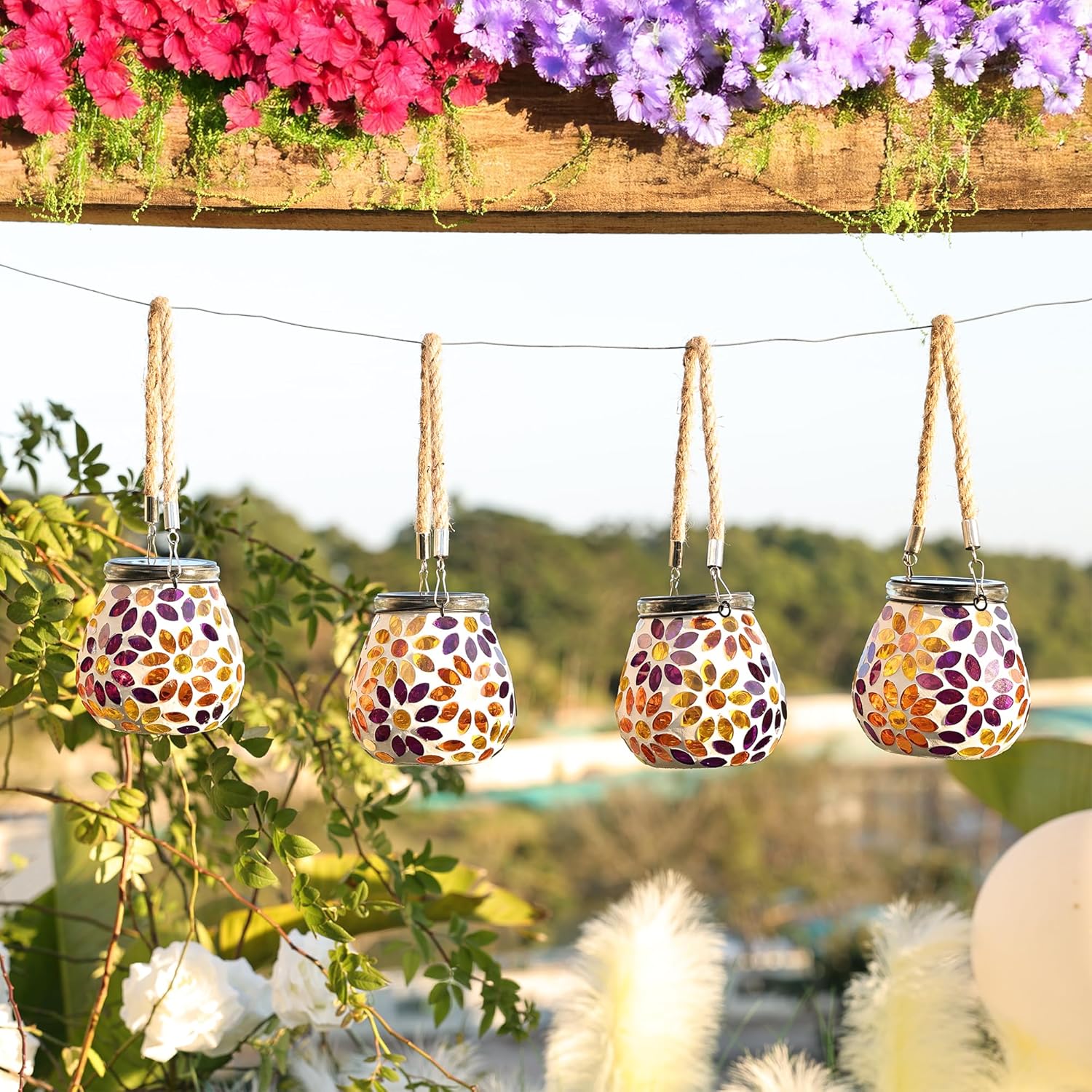 - 《 Effortless to Hang, Beautiful to Display》Hang it securely by the iron loop and rustic jute rope—from a tree branch, garden hook, or pergola beam. Or simply set it on your table or step—it shines either way.