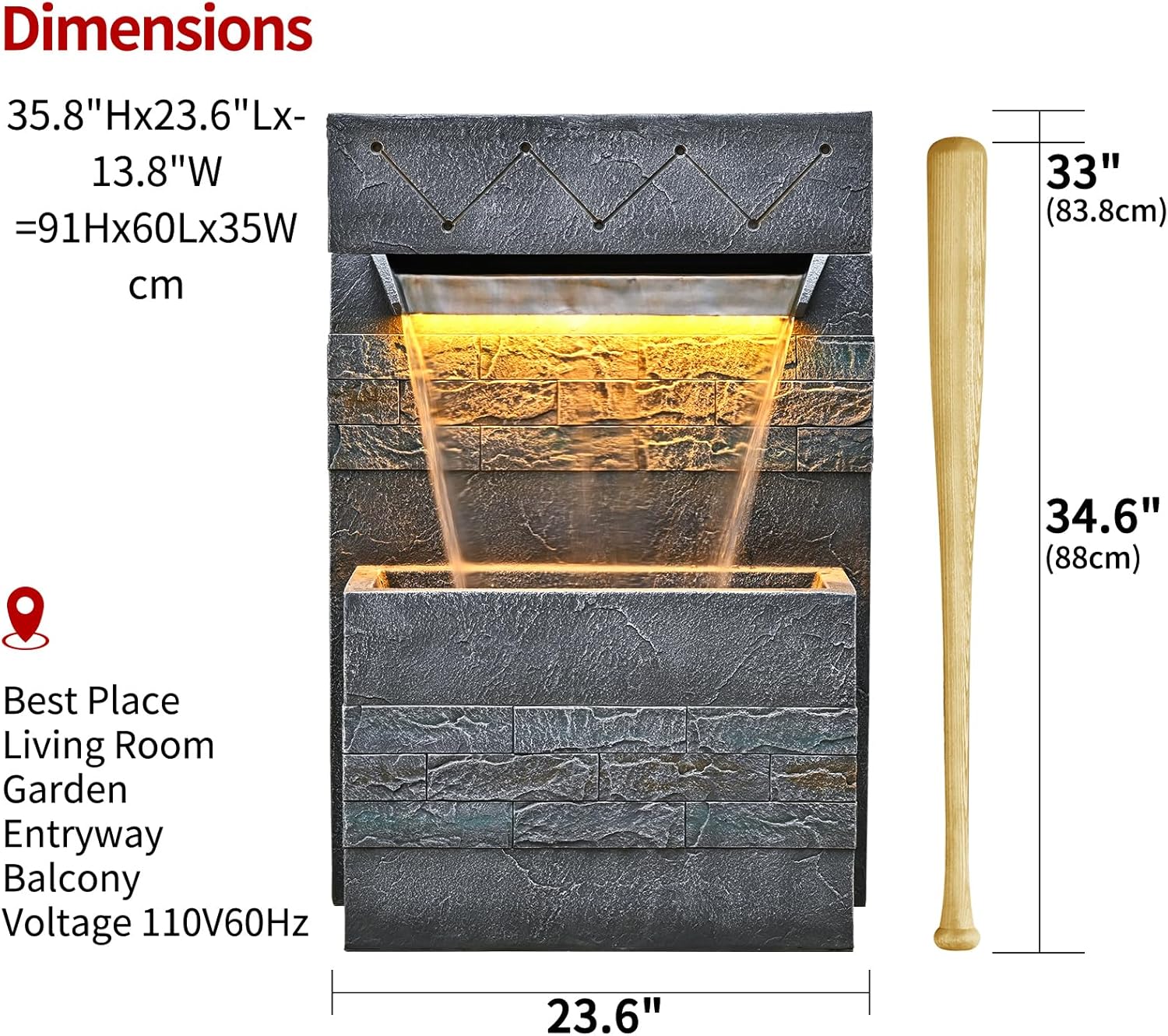 34.65'' Outdoor Garden Cascading Stone Floor-Standing Waterfall Fountain with LED Lights for Patio, Backyard, Deck, Porch and Home Art Decor