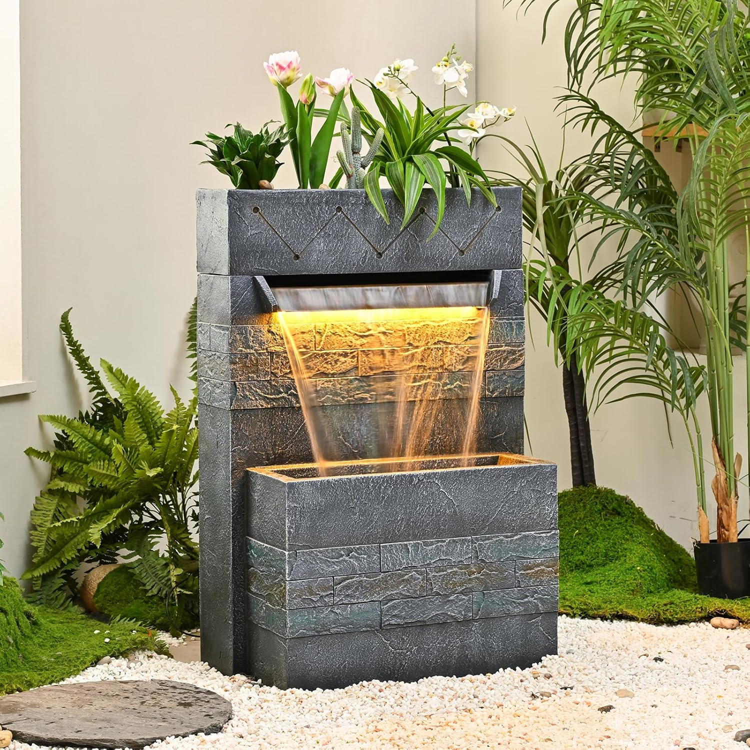 - Soft-Glow LED Lights: Equipped with built-in LED lights, this fountain illuminates your garden or patio, creating a mesmerizing ambiance for garden dinners or quiet evenings. Making it ideal for creating a relaxing atmosphere as night falls.