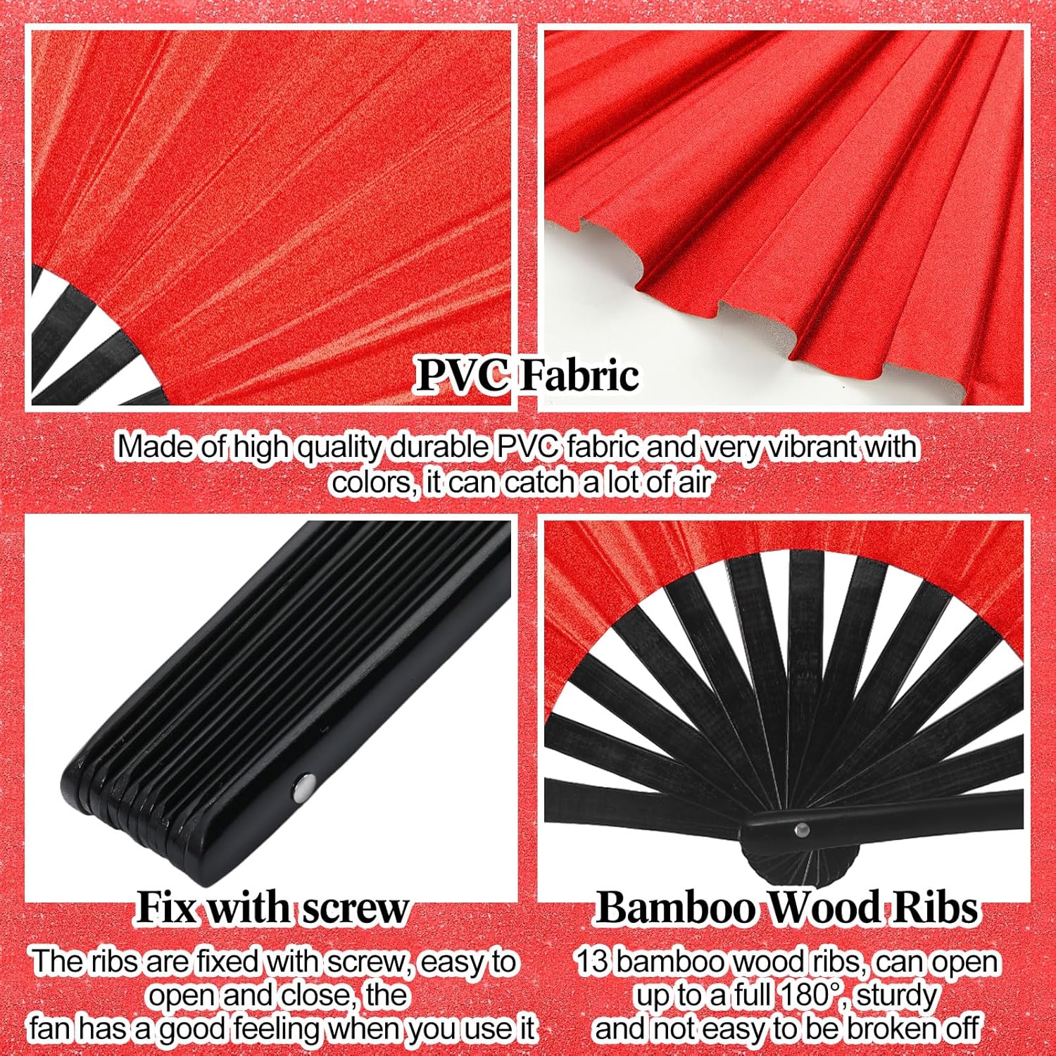 - Material and Measurement: made of quality plastic and laser dark red nylon cloth, lightweight and sturdy fabric, and each fan measures approx. 13.4 x 25 inches/ 34 x 63.5 cm (L x W, unfold state)