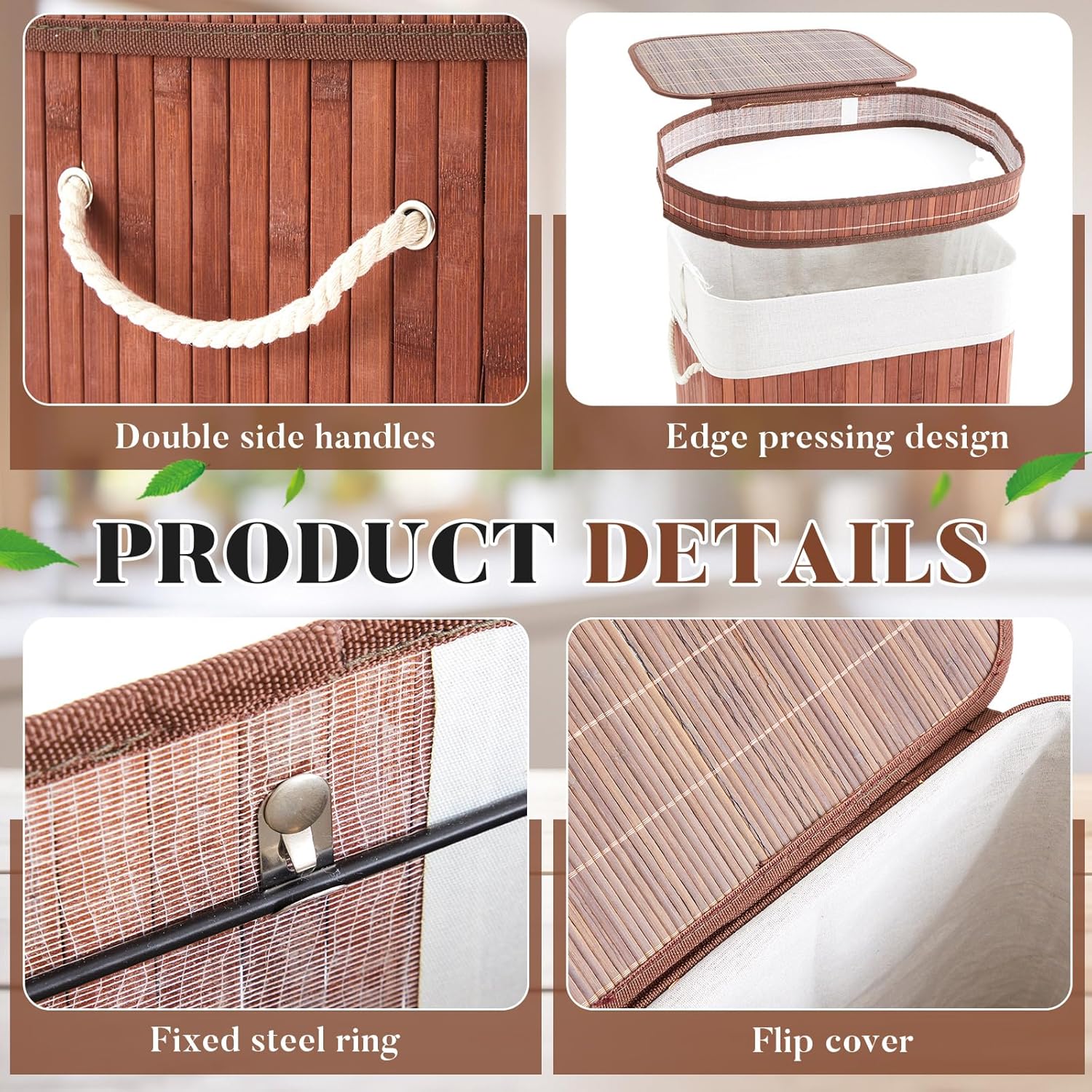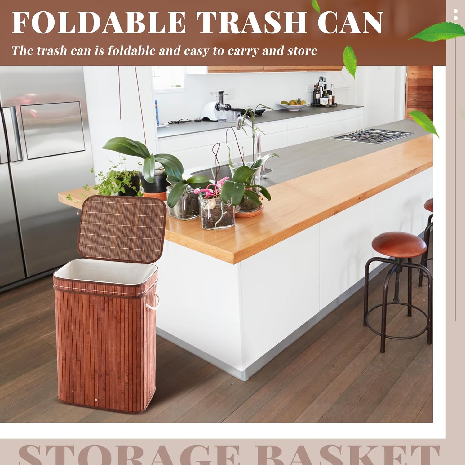 2 Pack Bamboo Slim Trash Can with Lid, 21 Gallon Large Rectangular Trash Bin, Foldable Slim Garbage Can Bamboo Waste Basket for Bathroom Bedroom Office Home Salon Spa (Brown)
